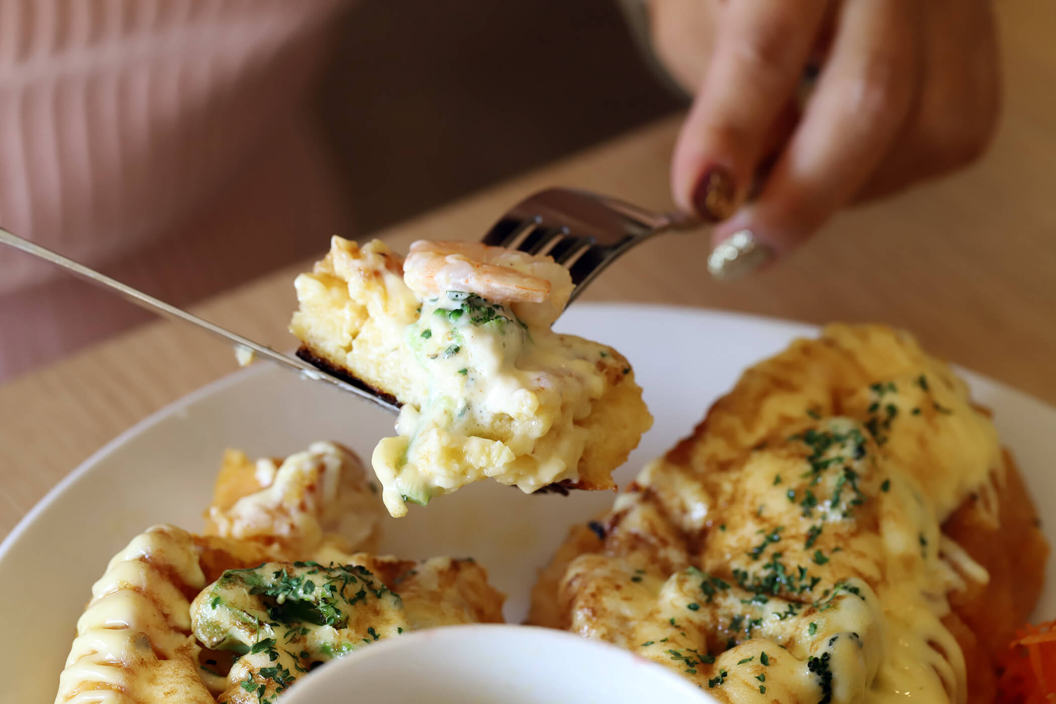 まわりはカリッと、中はとろとろふわふわのトーストがほんのり甘く、プリッとしたエビとブロッコリーが濃厚なこんがりマヨのヴェールをまとう。