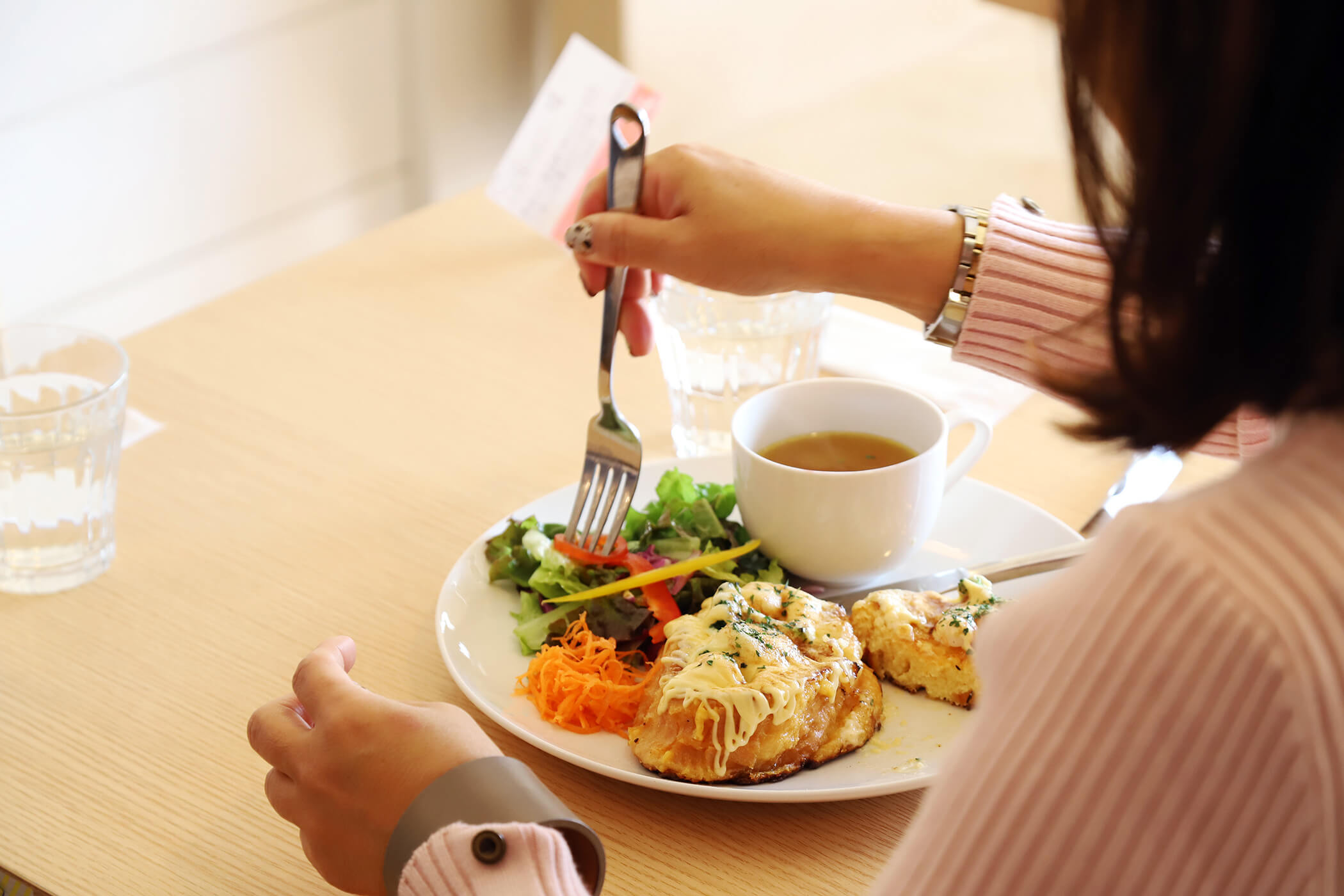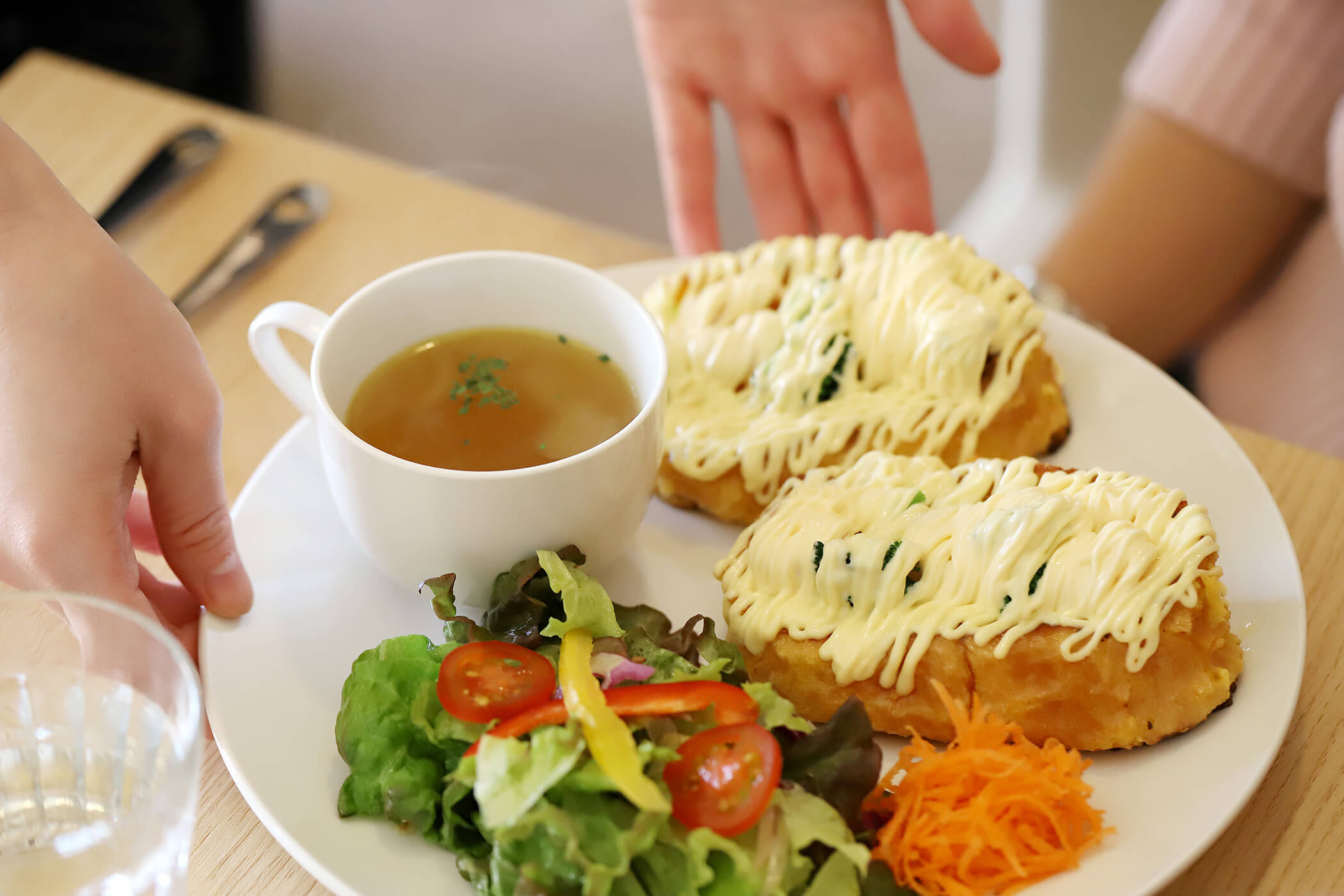 たっぷりのサラダとスープもついた、心ときめくプレート!