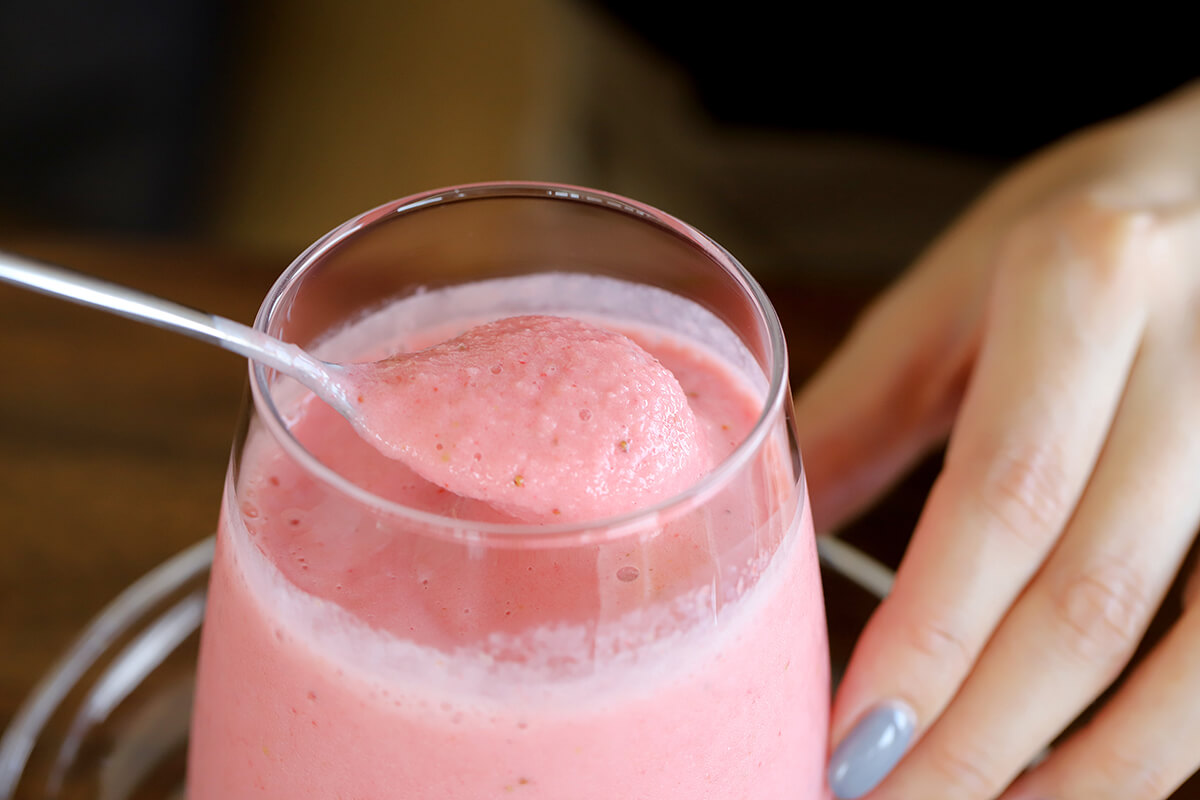 いちごをそのまま凍らせてフローズンにしているから、果肉のつぶつぶが感じられておいしい~!