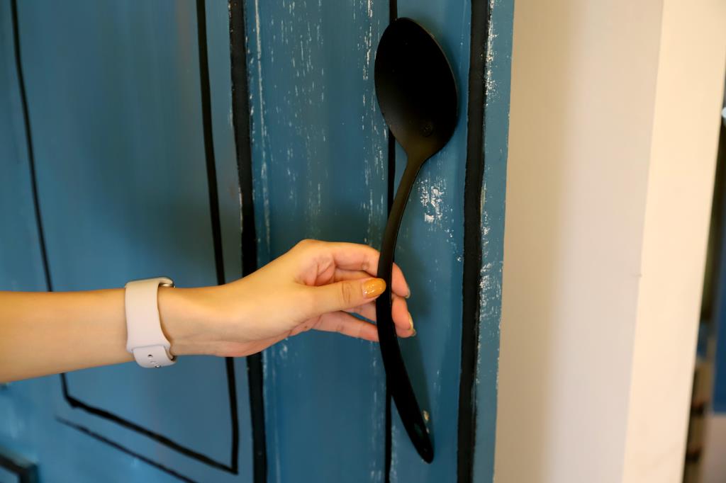 店内に入ってすぐ、大きなドアのオブジェが目に付く。