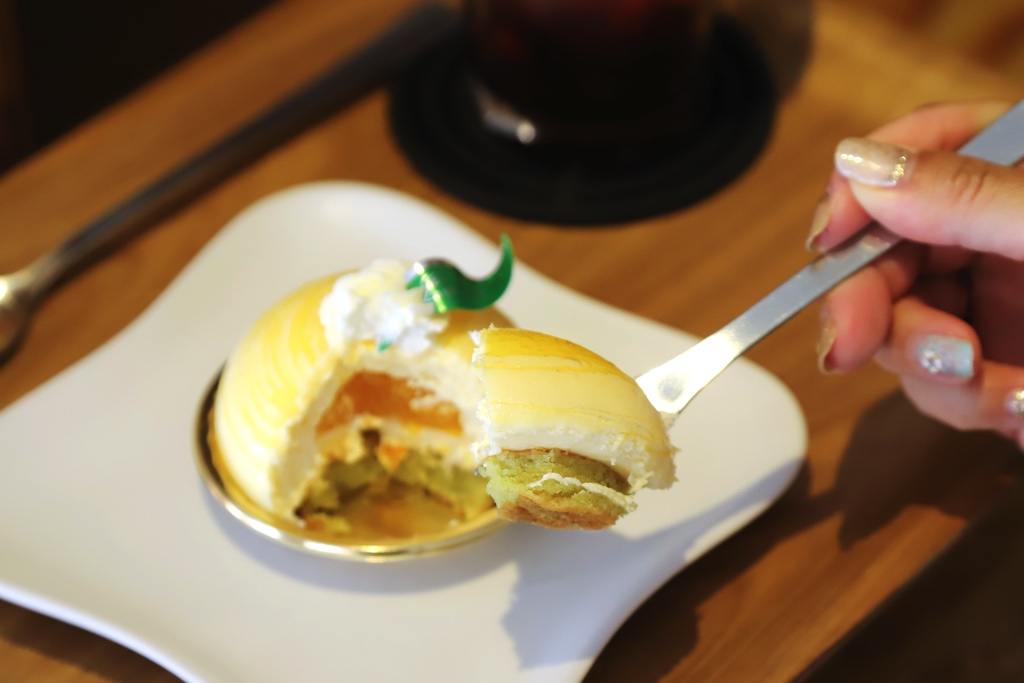 甘酸っぱいフロマージュの中にはオレンジのジュレ。舌に重なるピスタチオのフィリングが至福のマリアージュを完成させる。