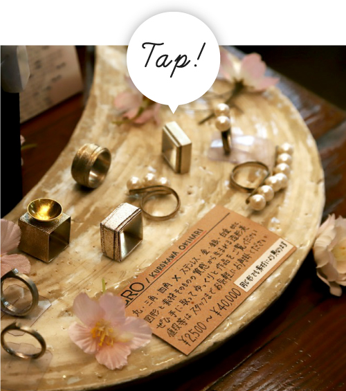 指にはめた瞬間、すっと馴染んで「あ、このリングは私の人差し指のために作られたんだ」と感じて、即決。価格のところをよく見ると¥2,500~¥40,000と表記が。私はこの時、何を思ったのか¥4,000と見間違えていた!でも選んだこのパールの指輪は、まだ手が出せる金額で一安心。御年76歳のジュエリーデザイナー黒川興成さんがデザイン、製作したリングで、くるりと交差したデザインが可愛すぎる!