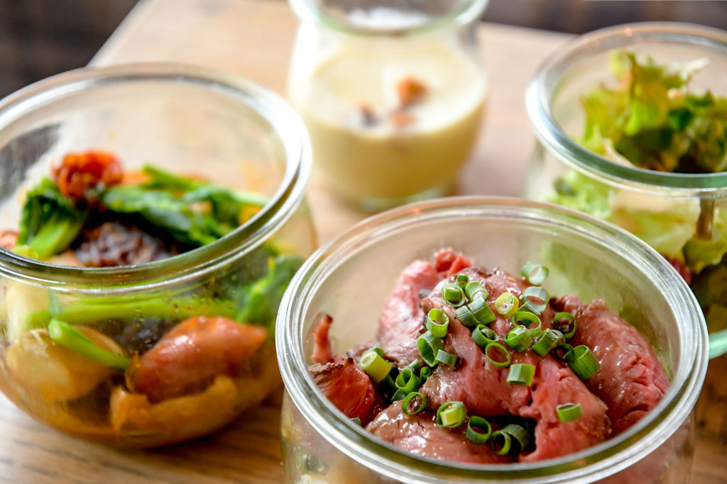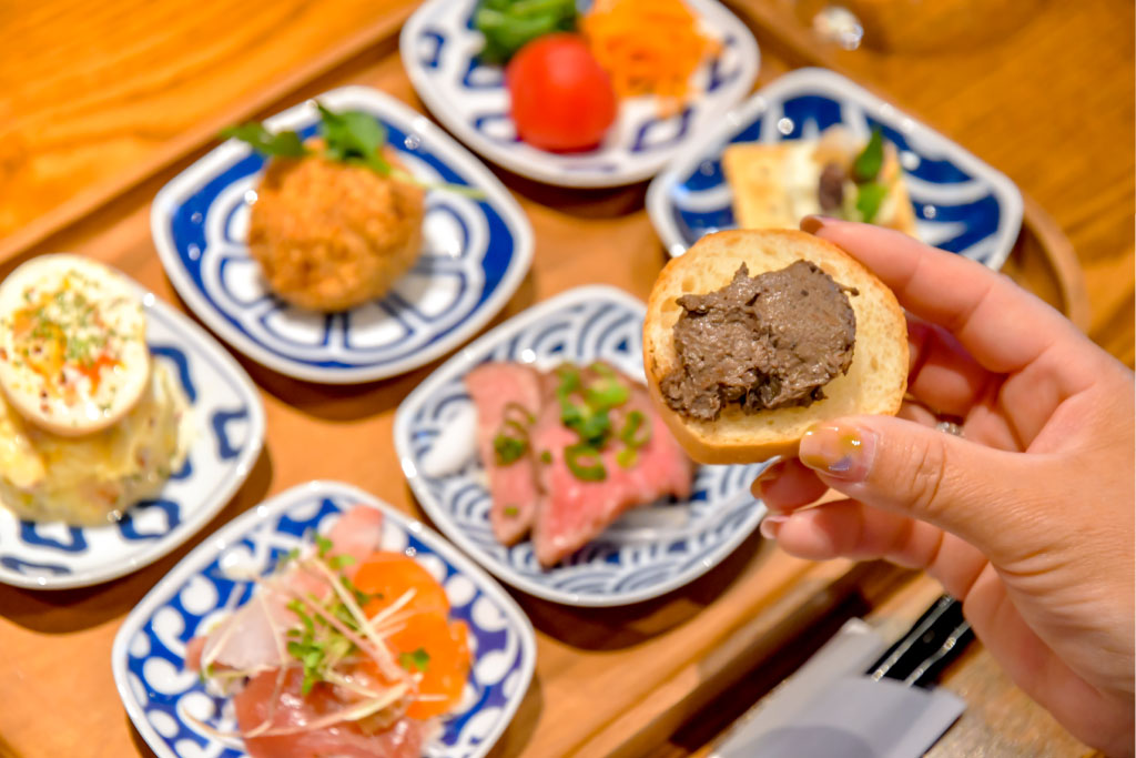 前菜の盛り合わせ 990円 ※内容は毎回変わる 和をベースにしたワインに合うおつまみが6品も味わえる、とってもリーズナブルなひと皿。野菜とハーブを約10種類使い、イチから手作りした臭みの全くないレバーパテや甲州ワインビーフのローストビーフなど、趣向を凝らした彩り豊かな逸品揃い!県産グラスワインを3種類飲み比べできるセット(赤/白)も1,200円とお得だ。