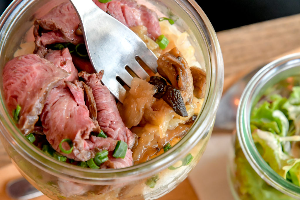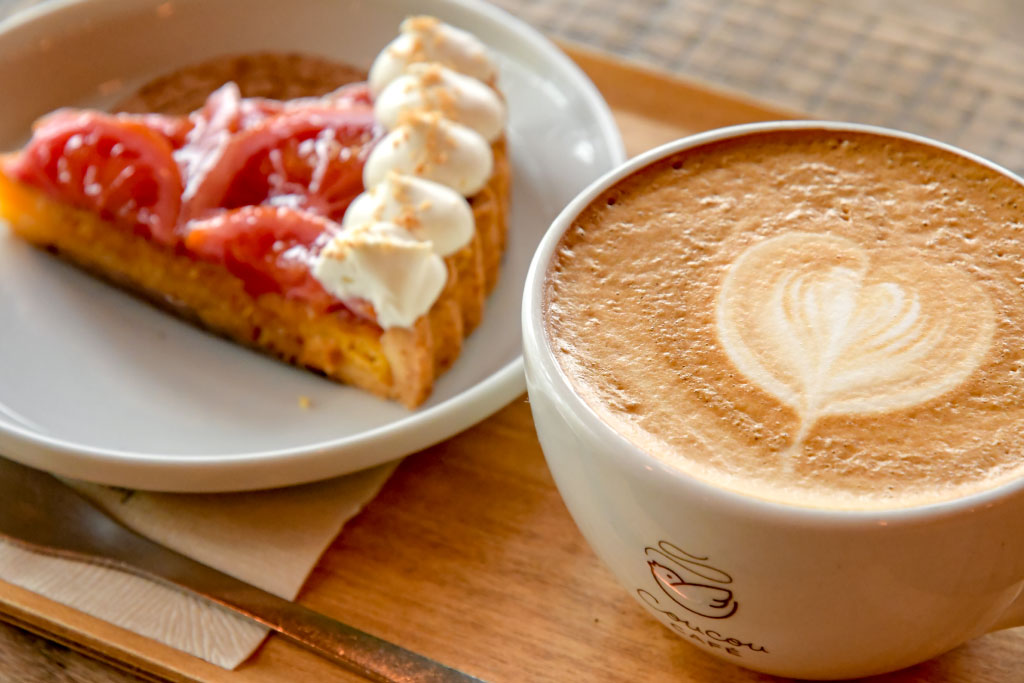 ※サラダ・スープ付。ドリンクセットは+220円 香ばしくグリルしたもも肉のローストビーフは驚くほどやわらかで、肉の旨味が凝縮された醤油ベースのホースラディッシュソースと相性抜群。バター香るきのこソテーやホワイトバルサミコ酢が効いた玉ねぎのチャツネがたっぷりご飯の上にのり、これがまた洋の味わいを醸し、美味しすぎる~。ブラッドオレンジのタルト(495円)とラテ(+385円)でカフェタイムも満喫。