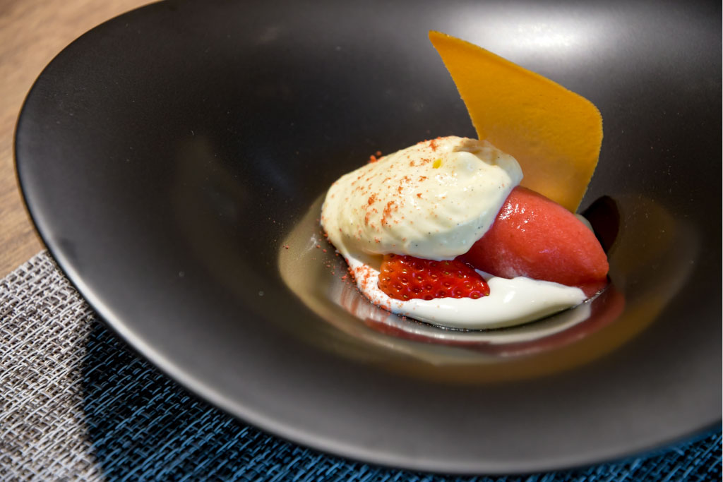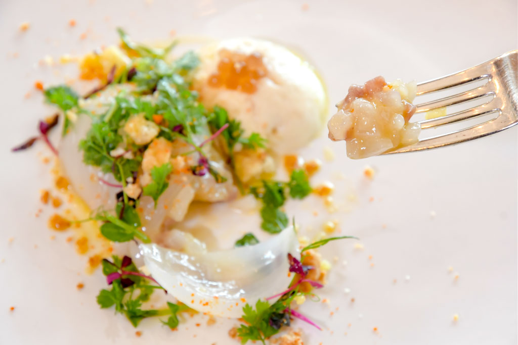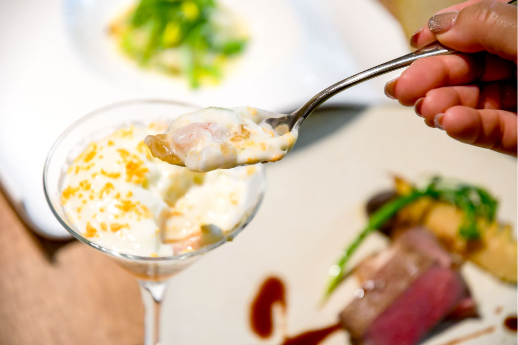 ラルブル 6,050円 2種類の前菜と魚、肉料理、デザート…その時々の一番美味しい旬の素材を腕利きシェフが独創的にアレンジ。この日の前菜の1品、甘エビのタルタルミモザ風は、ふわふわのカリフラワーのムースの中から透き通ったエビのコンソメゼリーと甘エビが顔を覗かせる。ホワイトバルサミコ酢の酸味と共に。苺のソルベとバニラ香るフロマージュブランのムースがコースを締めくくる。