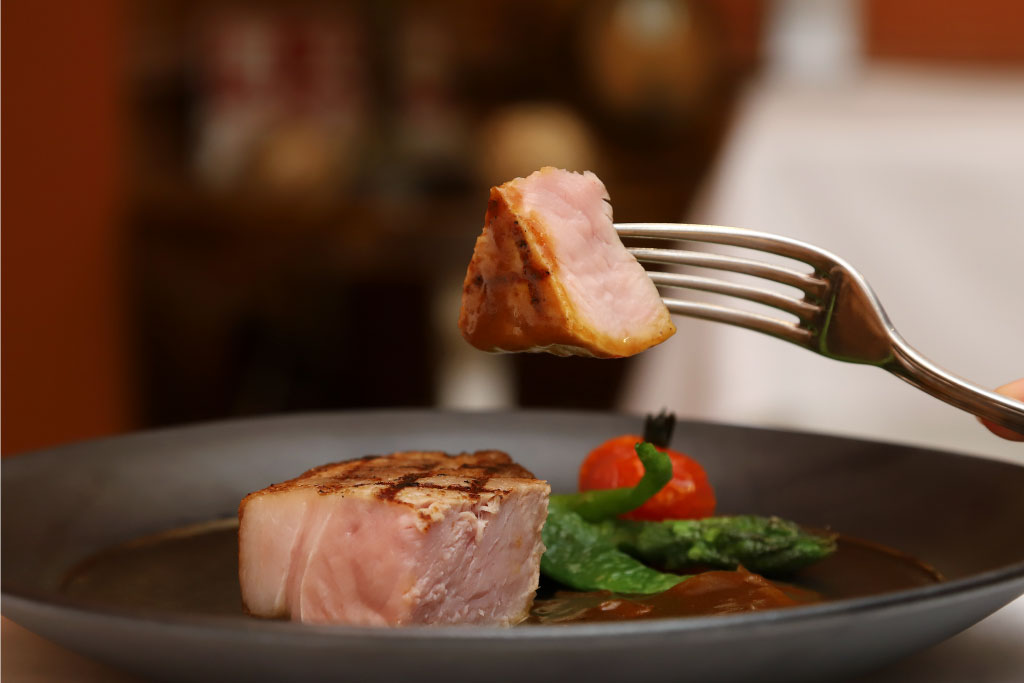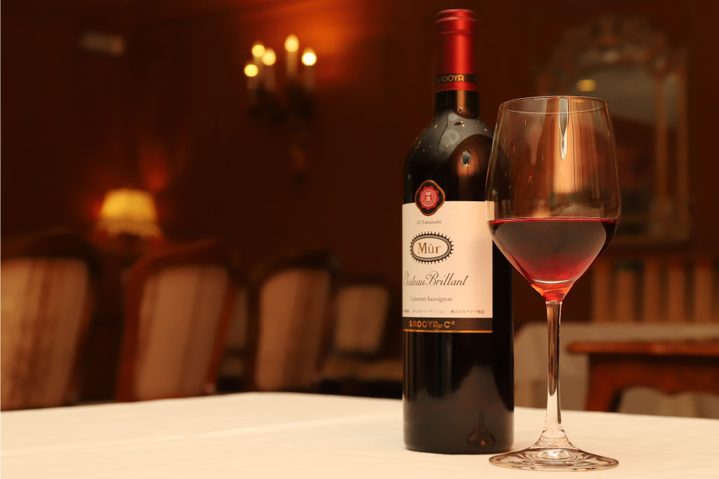 シャトーブリヤン ミュール(グラス)990円 ランチコースは季節の味わいを大切にし、月初めにメニューが変わる。毎回メインは3種類から選べ、そのどれもがワインと合うように開発されている。今回のメインは富士桜ポークの網焼き。厚く切ったポークは旨味が流れ出ないように低温でじっくりと火入れし、仕上げの網焼きで香ばしさをプラス。ワインは肉の甘みを包み込むような柔らかい渋みが特徴のシャトーブリヤンミュール。ワイナリーのレストランならではのマリアージュをご堪能あれ。