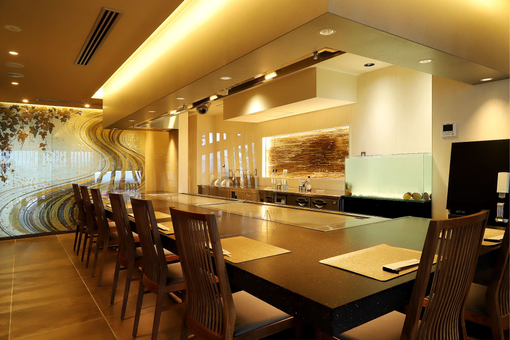 てっぱん秀Sは「てっぱん秀」の2号店。シックで落ち着きのある雰囲気の店内で高級牛の鉄板焼きを楽しめる。店内に入ると、肉の美味しい音と香りが漂い、食欲を掻き立てられる。高級感のあるカウンターはシェフが調理する様子を眺められる特等席だ。