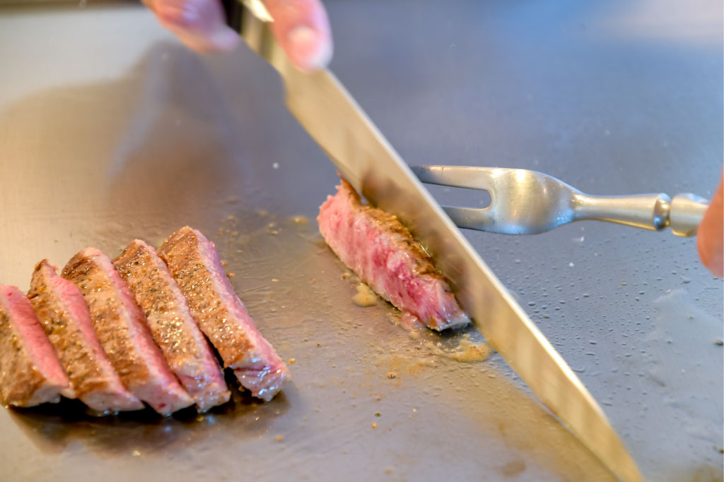 石和町のヤツドキテラス内にあるレストランで、ハイクラスな鉄板焼きを楽しめると話題!シックな大人の雰囲気漂うカウンター席では、シェフ自らが目の前の鉄板で厳選素材を見事な手さばきで焼き上げてくれる。美しくダイナミックな所作は見ているだけでウットリ…。