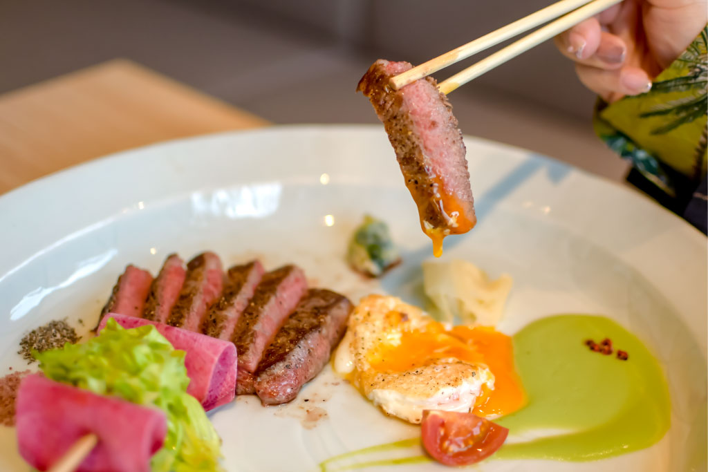 11,400円(サーロイン150g)※ランチ8,300円 鉄板の上で、お皿の上で、野菜や肉が次々と色鮮やかな絵を描くようにリズミカルに盛りつけられていく。フレンチ出身のシェフによる華麗なるライブキッチンは、まさに五感で楽しむ食のエンターテインメント。黒毛和牛の中でも雌牛のみに限定するこだわりの肉は舌の上でとろける美味しさ!種類豊富な色とりどりのソースが名脇役となり、コースを盛り上げる。