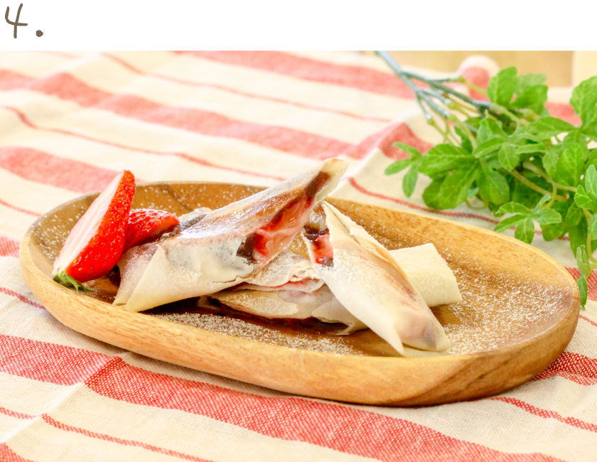 酸味が少なく、甘味が強いかなみひめはぜひデザートに!ジューシーな果汁が春巻きの中から溢れ、爽やかな甘さが広がる。イチゴの甘味にチーズの塩気が良く合い、止まらなくなる一品。
