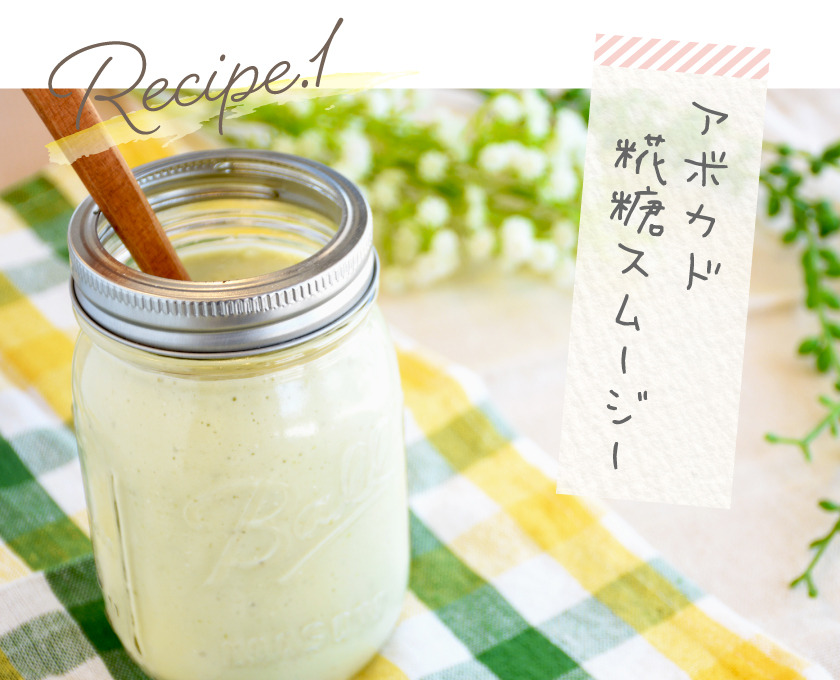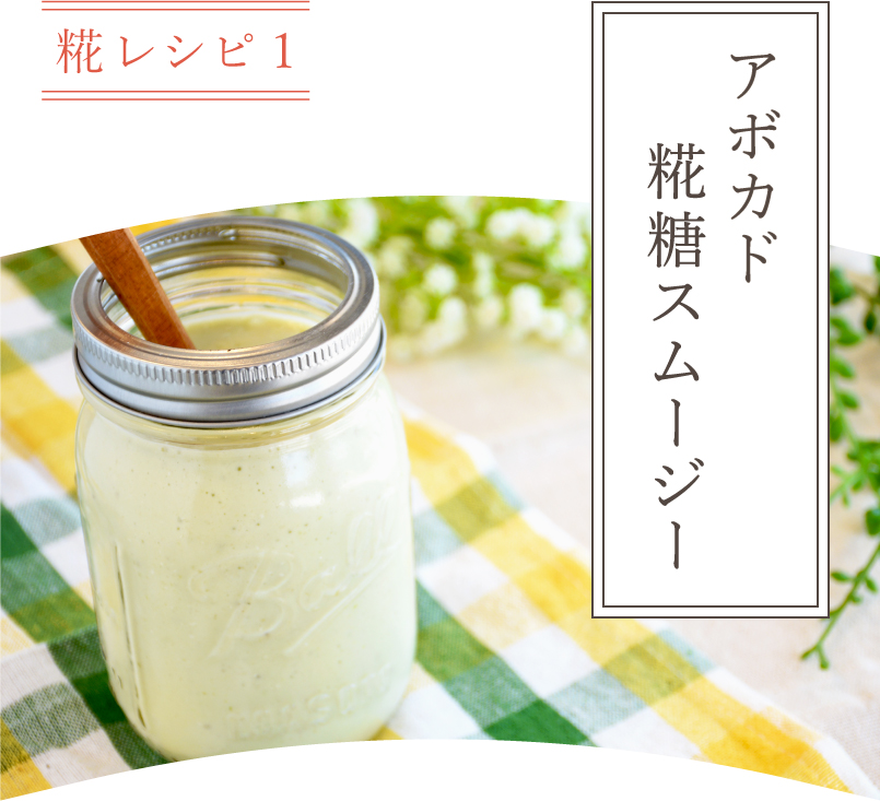 米糀と米粉のみで作った「糀糖」を使ったスムージーレシピ。やさしい甘さが特徴の糀糖は砂糖代わりに利用できる。熟したアボカドと合せて、まろやかで濃厚な味に。