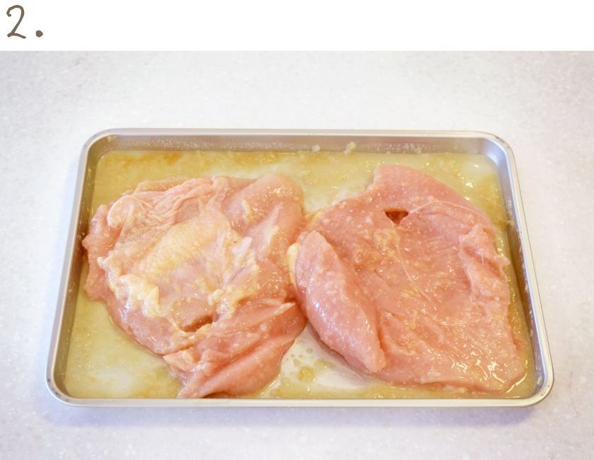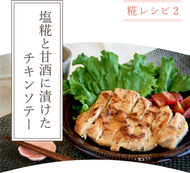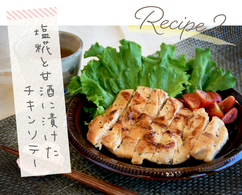 七賢の「塩糀」は米糀独特のまろやかな甘味と、天日塩の深みのある塩味が特徴。パサパサ感が強い鶏胸肉も塩麹の力で柔らかく、旨味をぐっと引き出してくれる。