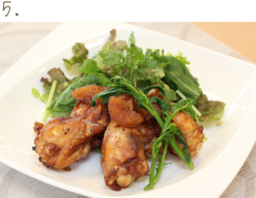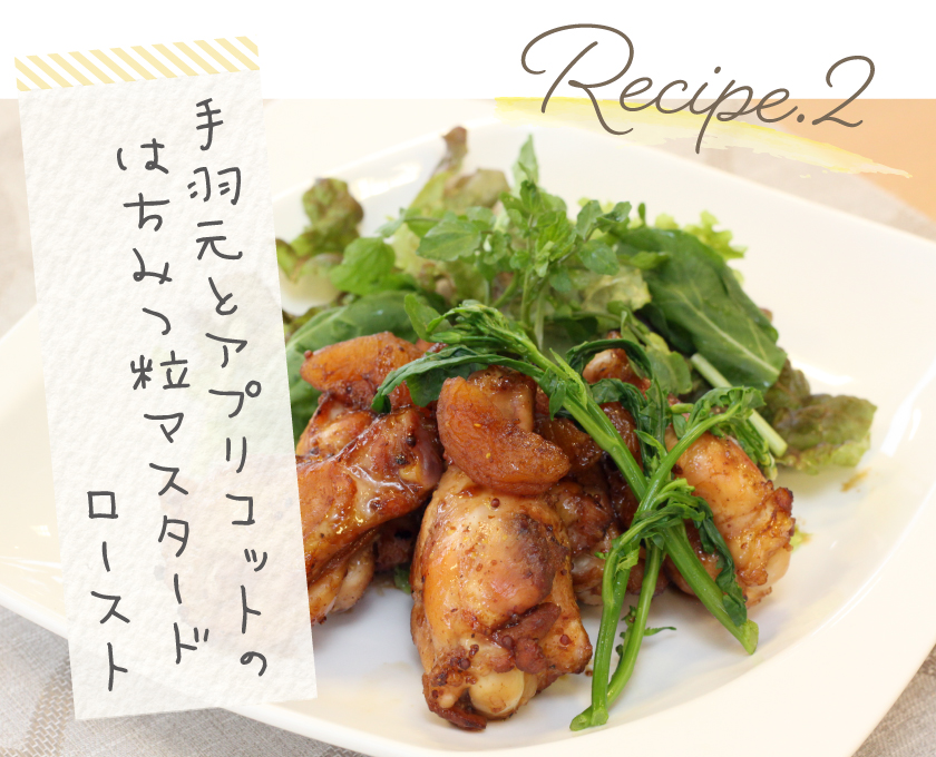 肉料理の味付けにハチミツを使用すると、身はやわらかくジューシーに仕上げることができる。はちみつと相性のよいマスタードを加えれば、鶏手羽元を進む手が止まらなくなる一品に。ドライアプリコットの甘みと鶏肉の組み合わせも抜群。