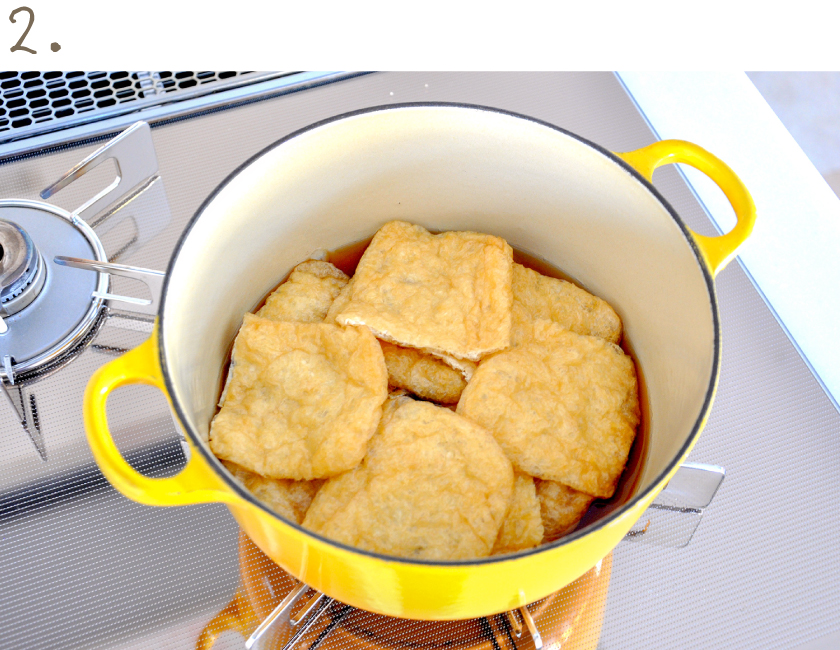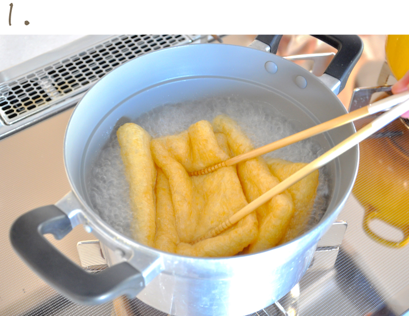 油揚げを半分に切り、沸騰したお湯で30秒ほど茹でて油抜きをし、ざる上げした後、油揚げが崩れない程度に水気をしっかりしぼる。