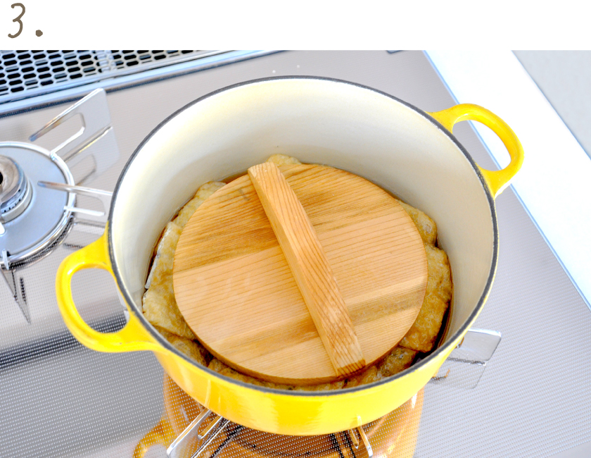 煮汁が沸騰するまで中火にかけ、沸いたら落し蓋をして弱火で10分炊く。その後火を止め、鍋ごと冷やす。