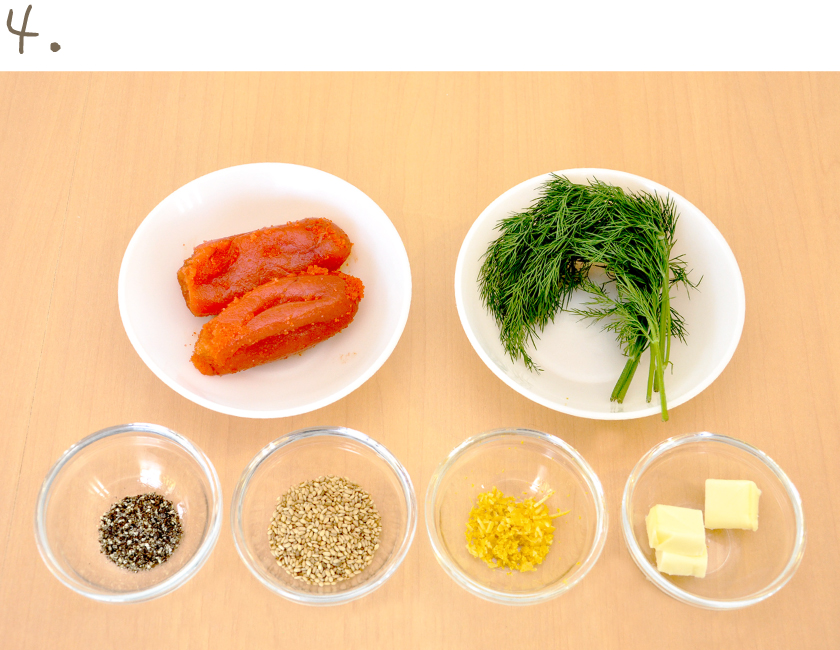 辛子明太子は皮からはずし、ディルは細かく刻む。バターは10~20秒ほどレンジにかけ、溶かす。