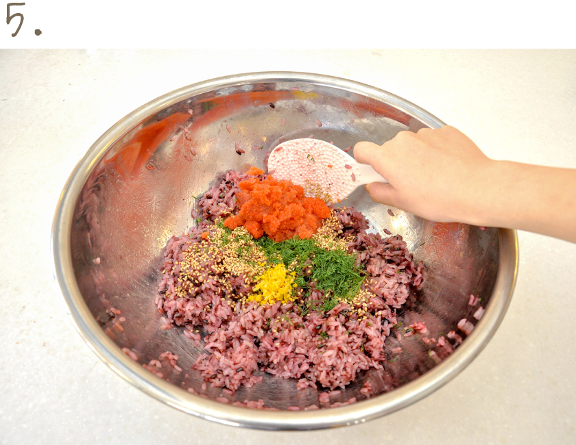 酢飯を2合分取り分け、用意しておいた辛子明太子、ディル、溶かしバター、レモンの皮のすりおりし、白ごまを入れて混ぜ合わせる。お好みで黒胡椒も入れる。
