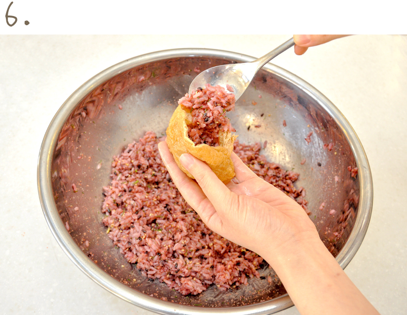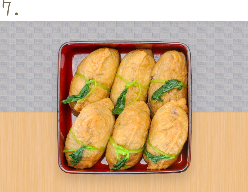 煮付けた油揚げの汁気をしぼり、油揚げがやぶれないよう注意しながら、酢飯を中にギュッと詰めていく。お好みで茹でて冷ました三つ葉でしばる。