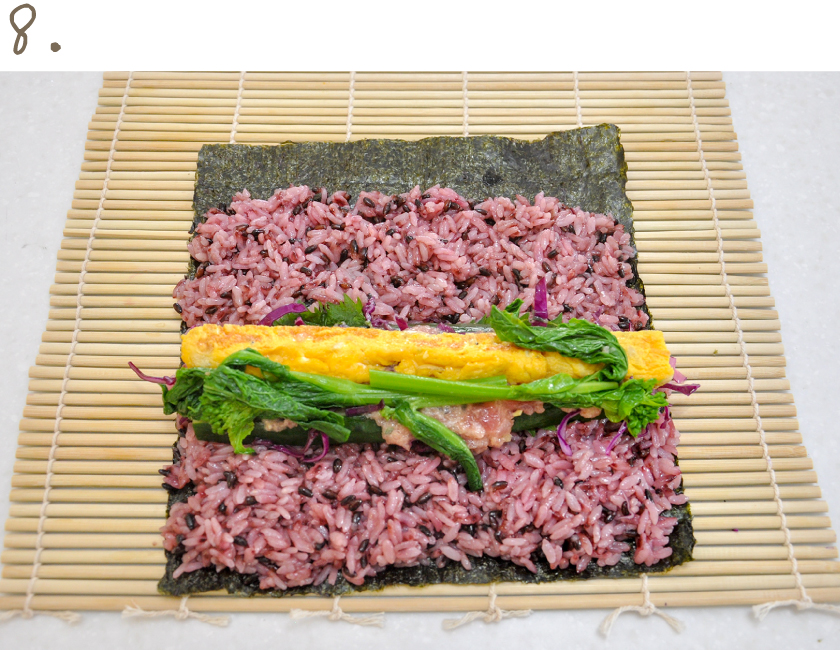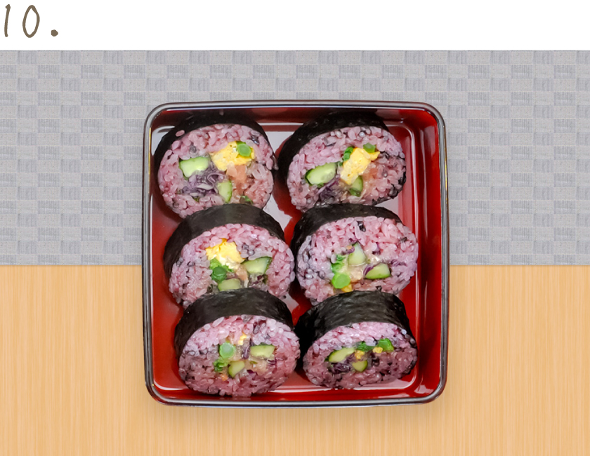 大葉2~3枚→きゅうり2本→きゅうり2本の間に紫キャベツ→マグロの中落ち→しらす入り卵焼き→菜の花の順で並べていく。