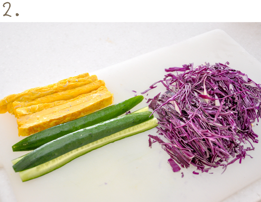 玉子焼き・きゅうりを海苔の大きさに合わせた長さで1cm幅に切る。紫キャベツは千切りにする。