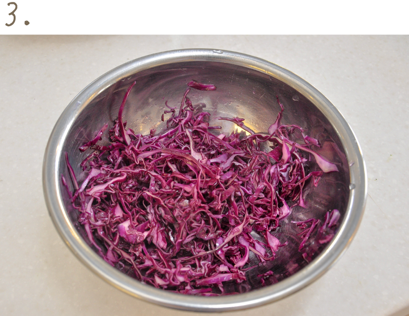 紫キャベツを塩小さじ1/2をなじませて5分ほど置き、しんなりしたら酢と和える。菜の花は、塩を小さじ1/2入れた沸騰したお湯で好みの硬さになるまで茹で、冷ます。