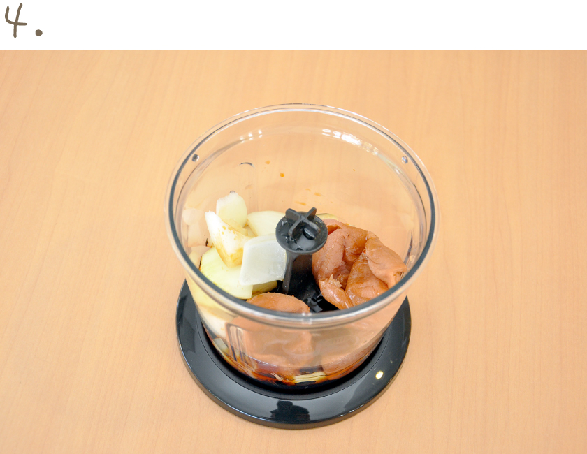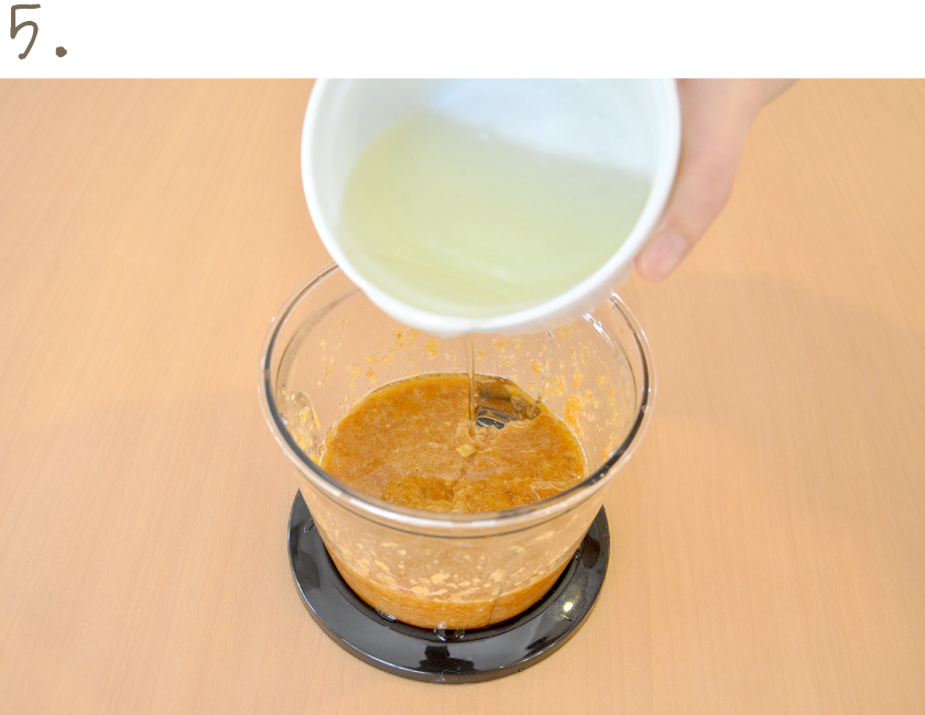 ペースト状になったら少しずつサラダ油を加え泡立て器で混ぜ合わせる。