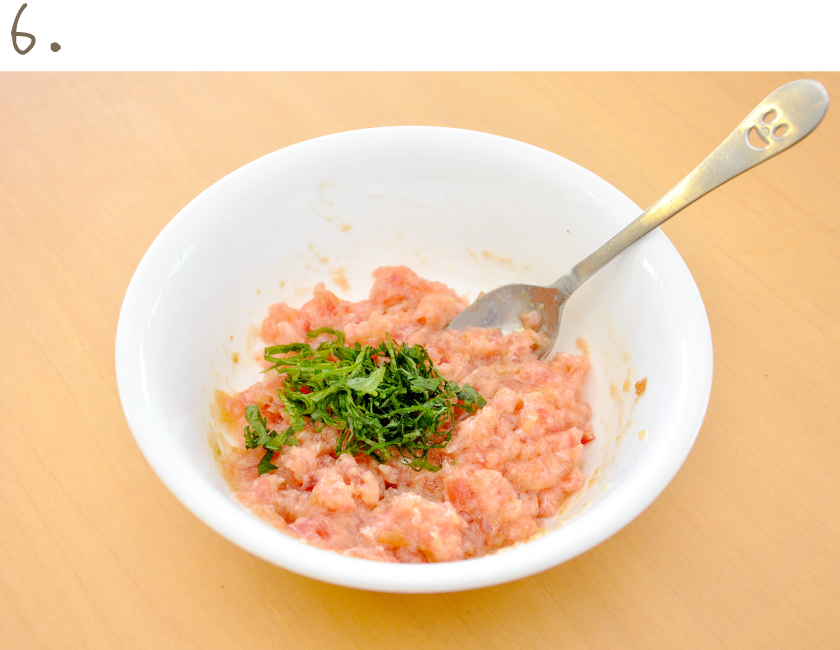 できあがったドレッシング大さじ2とマグロの中落ち、大葉1枚を細かく刻んだものを和える。