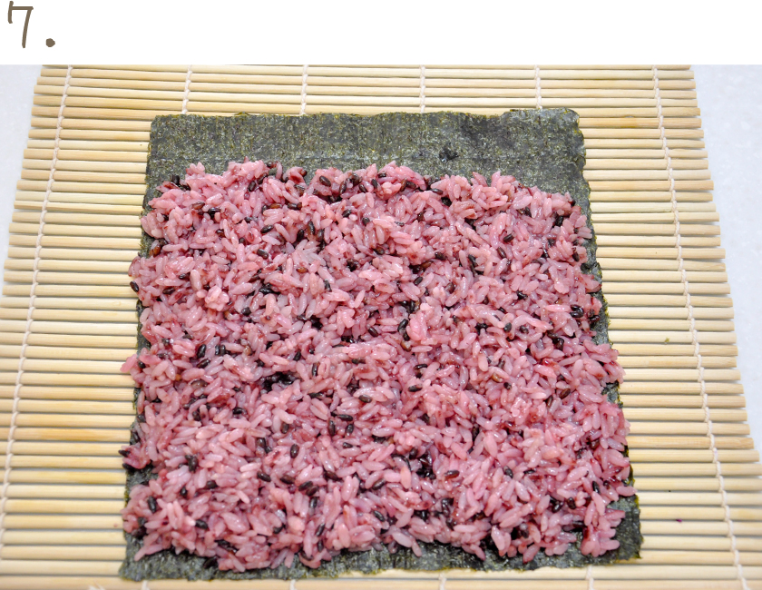 海苔の上2cmほどを残し、海苔が少し透ける程度に酢飯をまんべんなく均一に広げる。