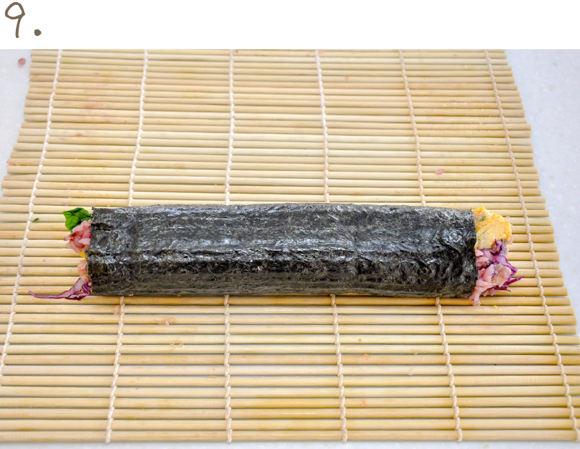 指で具材をおさえながら手前から巻き簀ごと持ち上げて、一気に巻く。