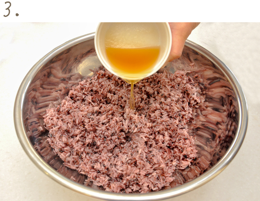 ②を炊き立てのごはんに回しかけて、切るように混ぜ合わせたら、レモンの絞り汁を加えて更に混ぜ合わせる。