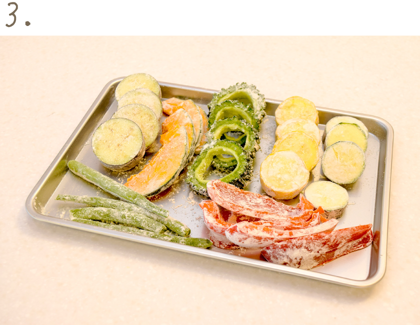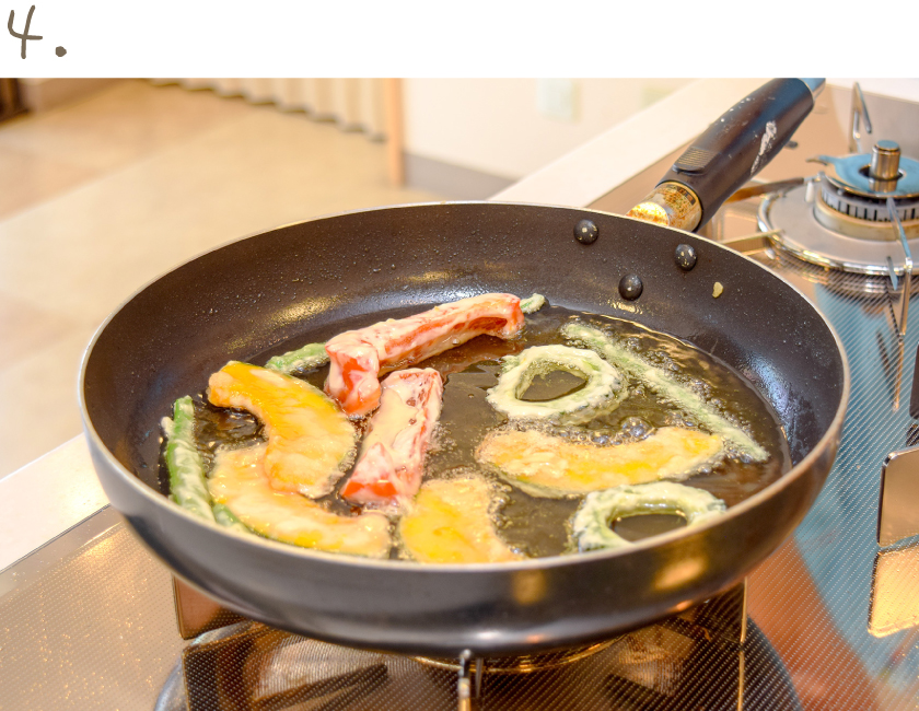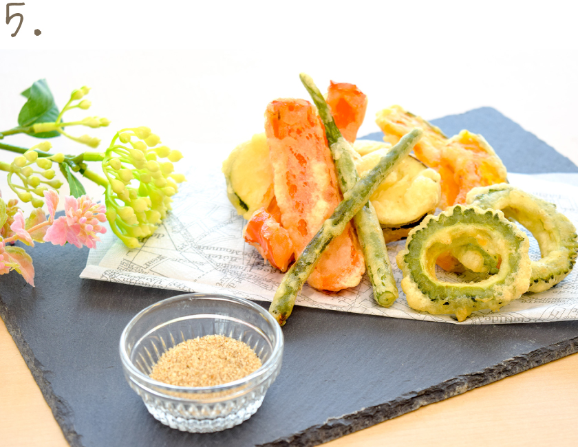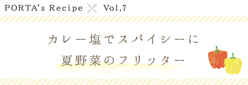 夏の野菜は色とりどりで栄養満点。それをフリッターにすれば、美味しく&栄養を逃さず食べられます。しかも今回はうま味とスパイシーさをプラスする。カレー塩を添えて。おかずに、おつまみに、手軽に作れる一品です。