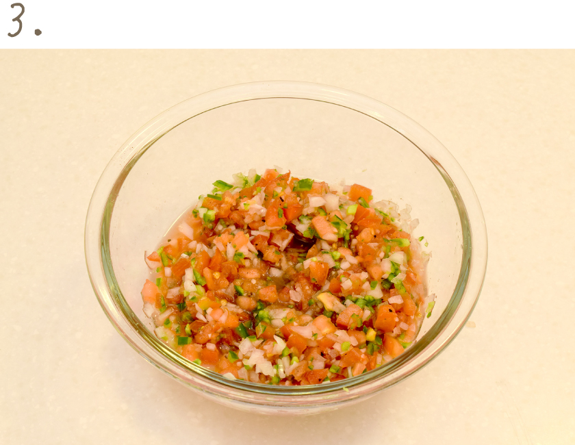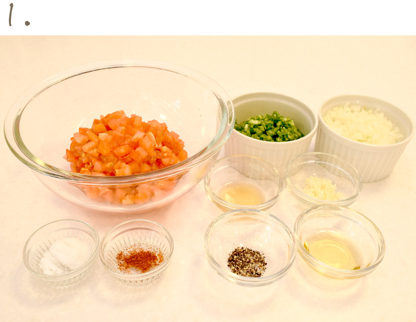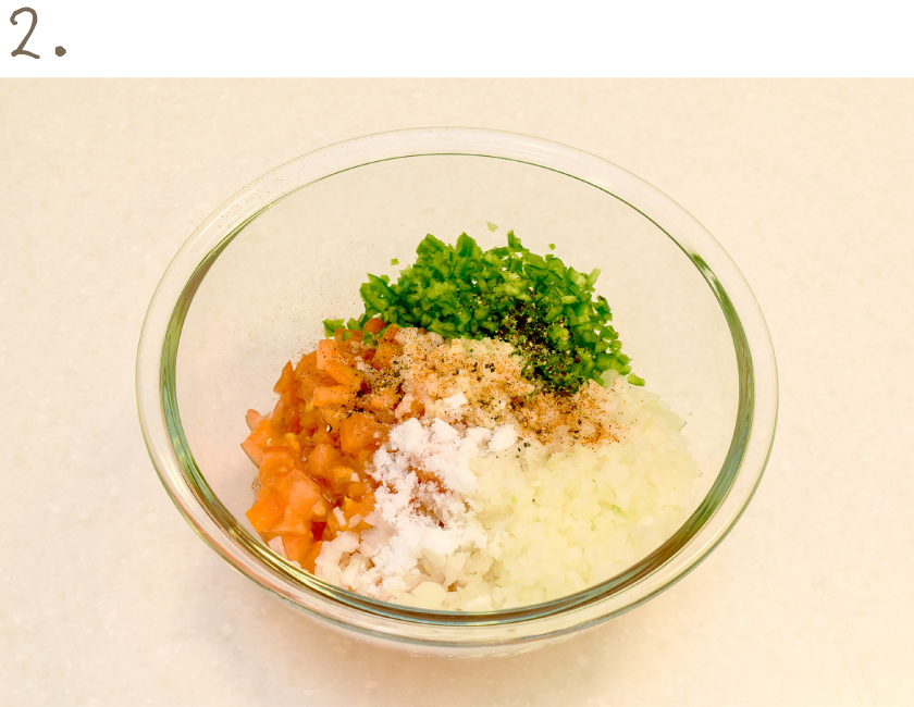 トマトは種を取り角切り、ピーマン・玉ねぎ・ニンニクはみじん切りにする。切った玉ねぎは水にさらしておく。