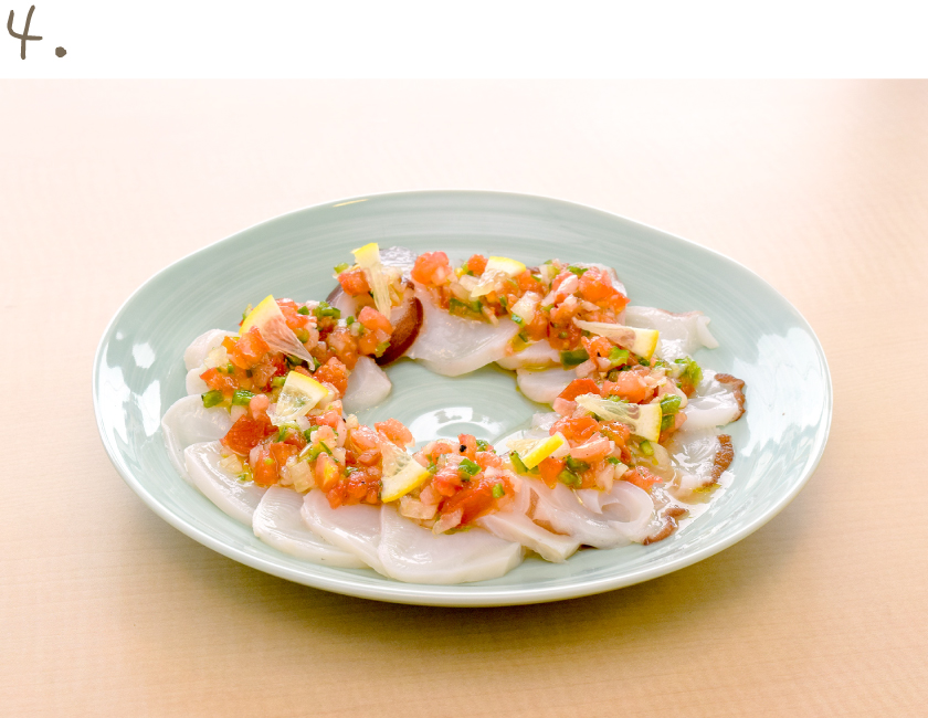 アレンジ①お刺身にオリーブオイルとレモンをかけて、タコのカルパッチョに。