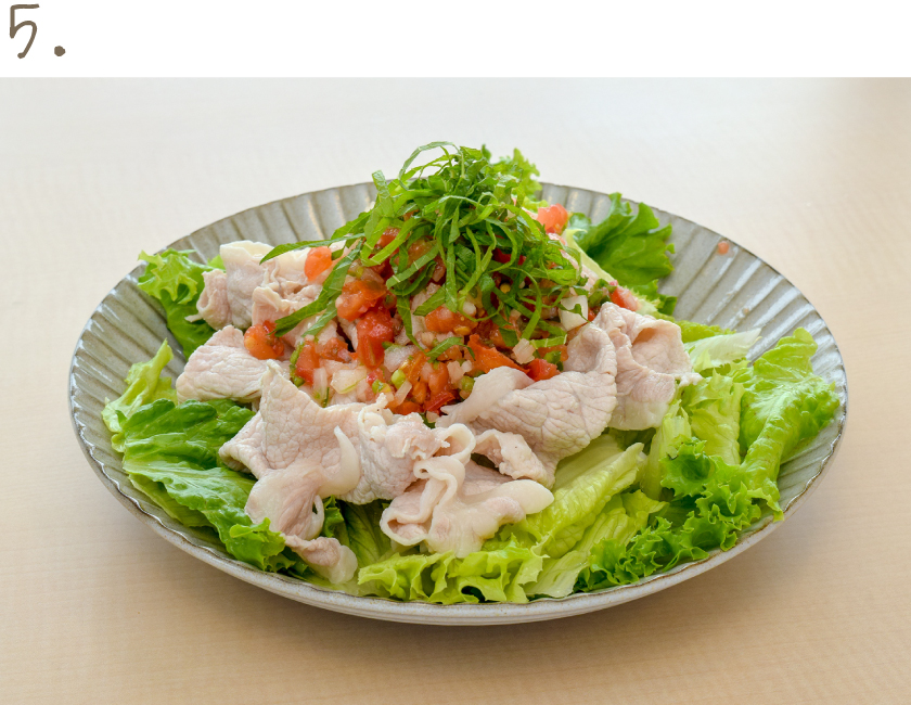 アレンジ②冷しゃぶにゴマ油と大葉をかけて、冷しゃぶのサルササラダに。