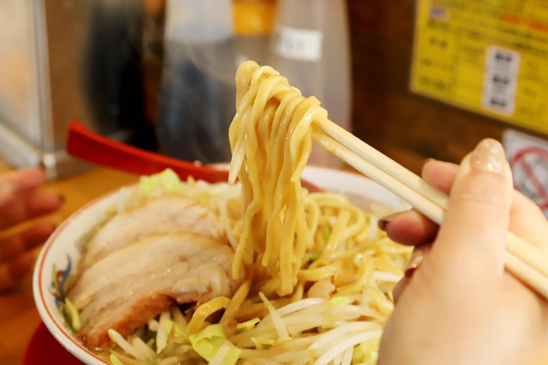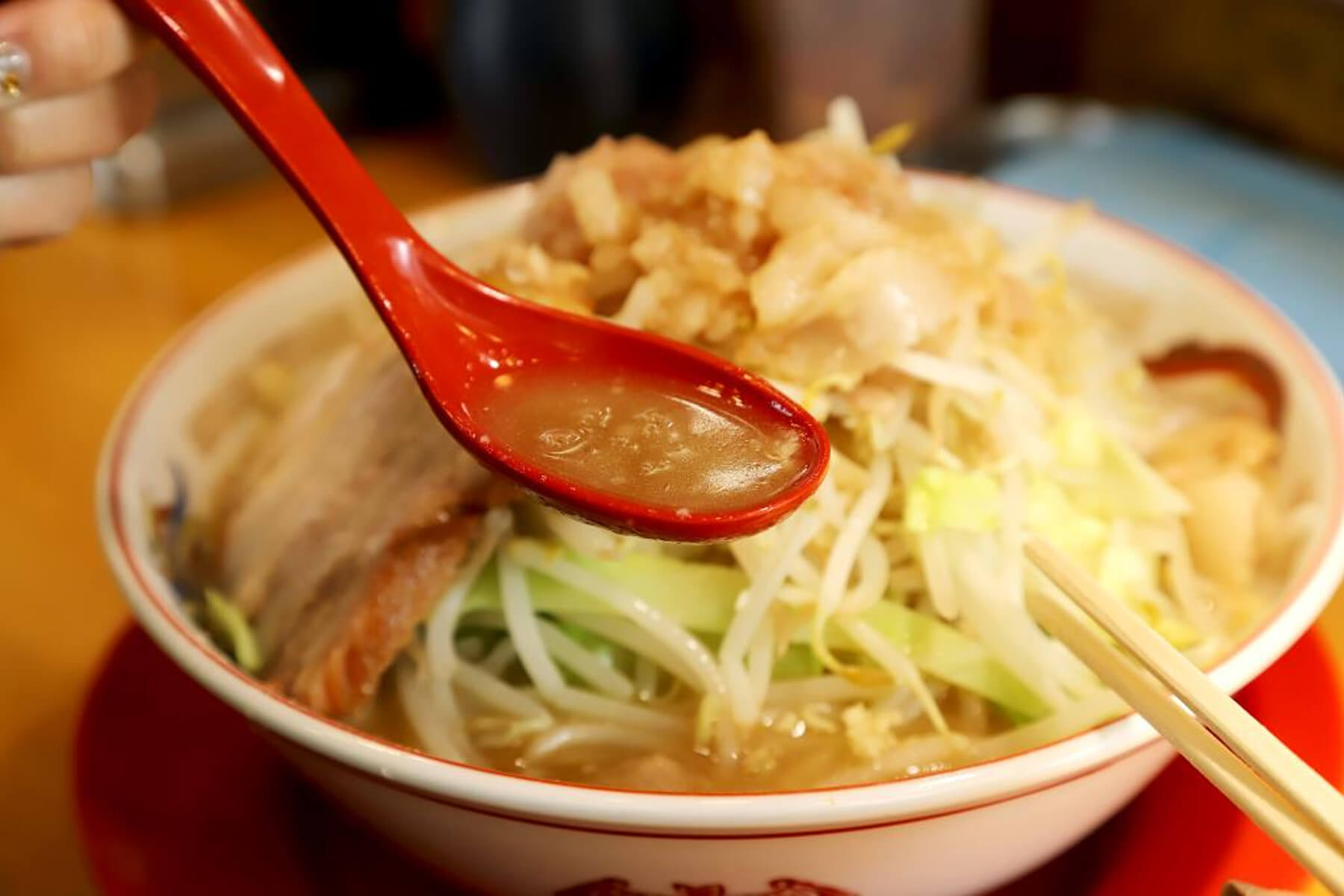 醤油が効いたスープは、背アブラとニンニクと相性が良く、まろやかな醤油の甘みと相まって旨みが溢れる。