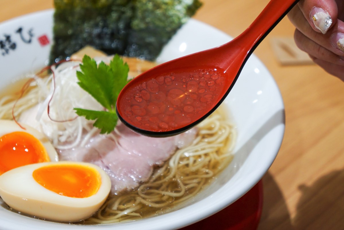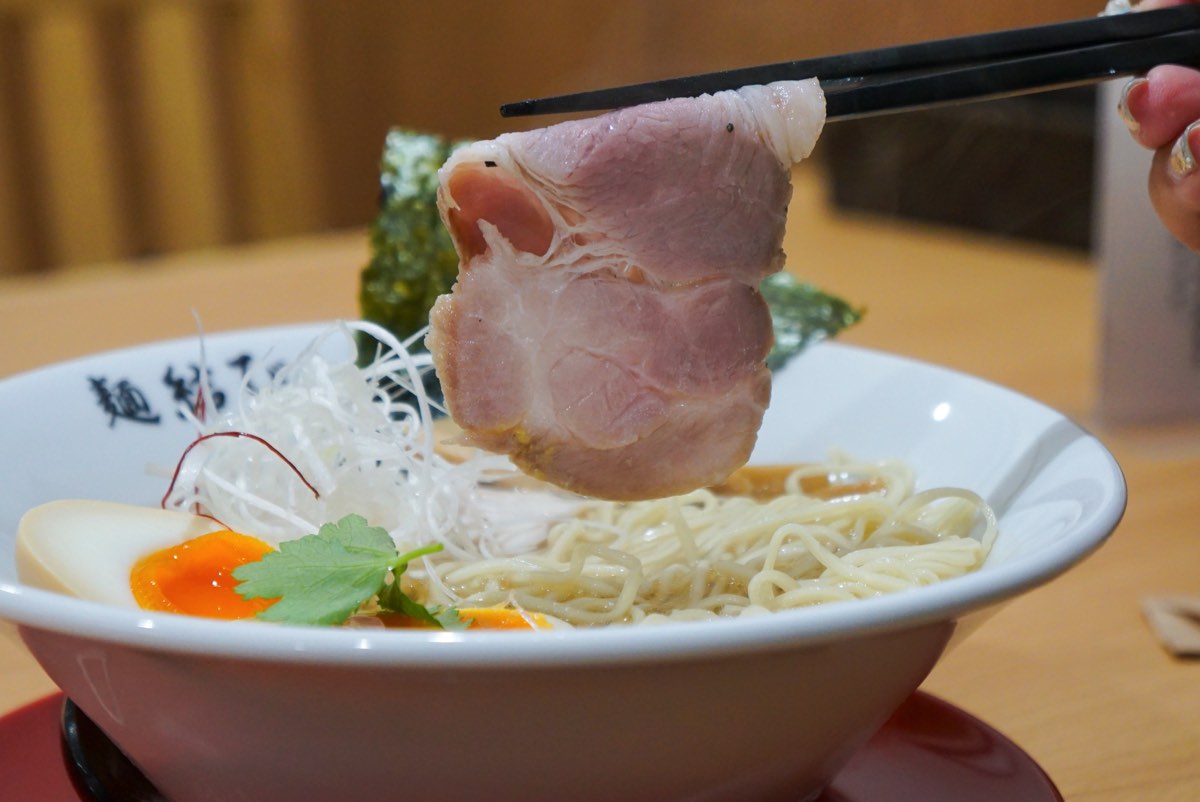 透き通るようなスープの上には低温調理の鶏・豚のレアチャーシューや味玉、三つ葉や糸唐辛子が上品に盛られていて、美しい見た目に引けを取らない味わいが推しポイント。