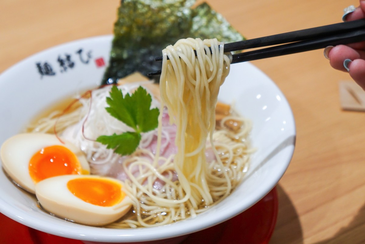麺結びの話題のラーメン「貝出汁旨塩そば」は、島根県宍道湖産しじみとあさり、ほたての貝柱でしっかりと出汁を取り、あっさり飲みやすい淡麗系スープが特徴。