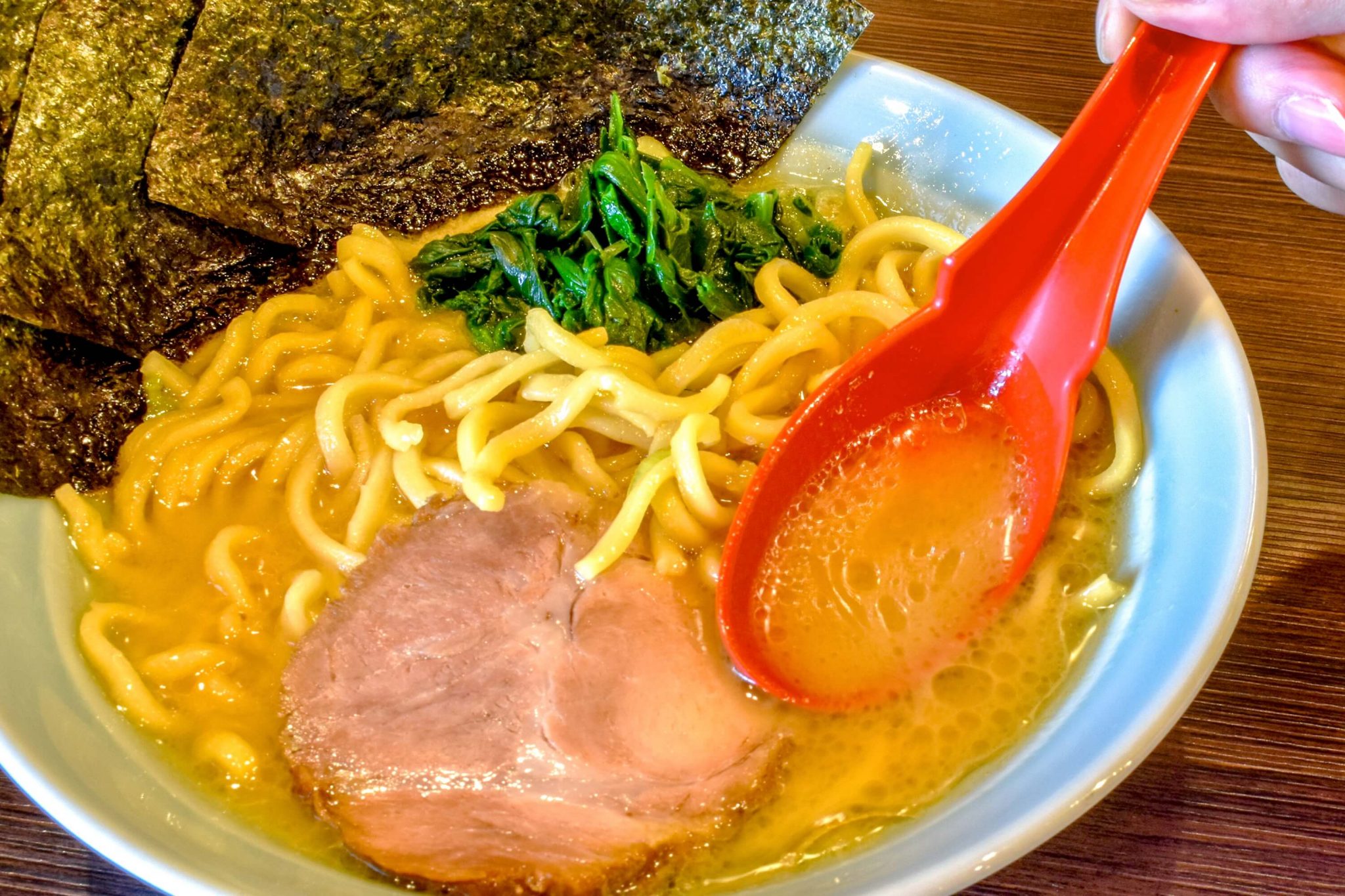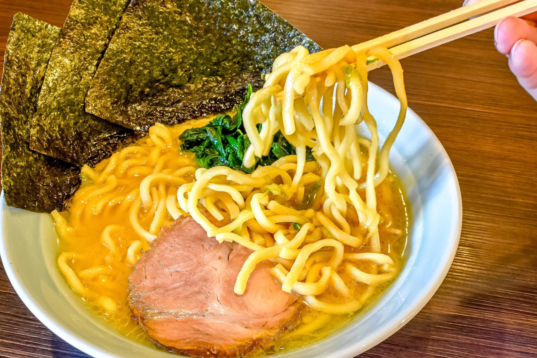 濃厚でマイルドなとんこつスープがよく絡む中太麺。短めのブツブツと切られた定番・家系スタイルで、もちもち!スープとの相性もピッタリで、麺の硬さも選べる。