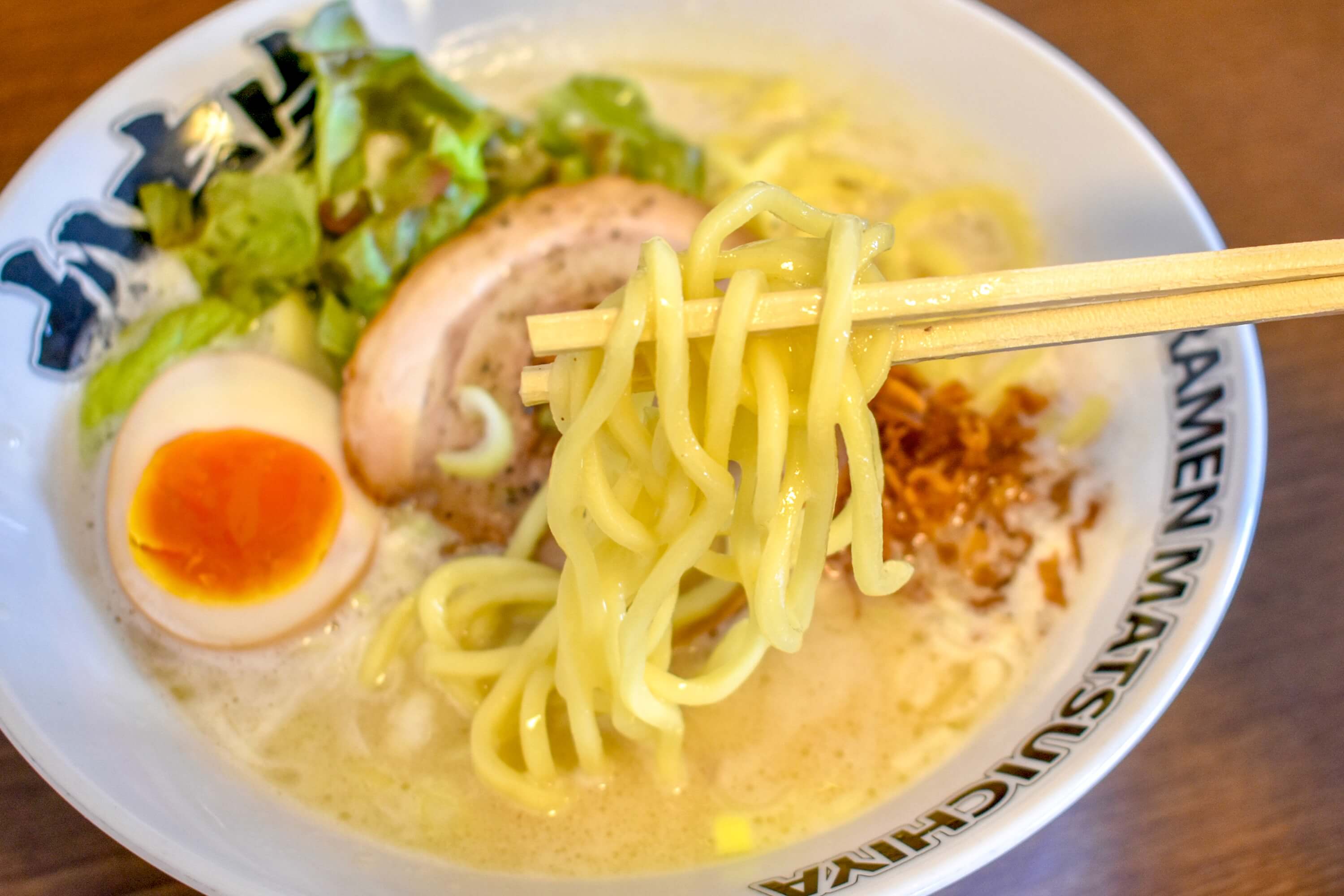 もっちりとして、小麦を上品に感じることができる松壱家ラーメン定番の中太麺。濃厚スープとのバランスが最高。