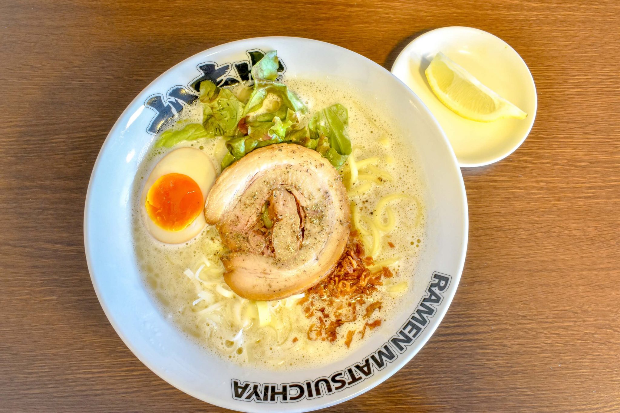 サニーレタス、オニオンフレークなど珍しいトッピングが、この極み鶏には合う。さっぱりとサニーレタスをそのまま食べても、しっかりコクがあるスープに絡めてもOK。オニオンフレークと麺、スープを一緒に食べると、また一味変わり、さらにレモンを絞ればさらに変化!