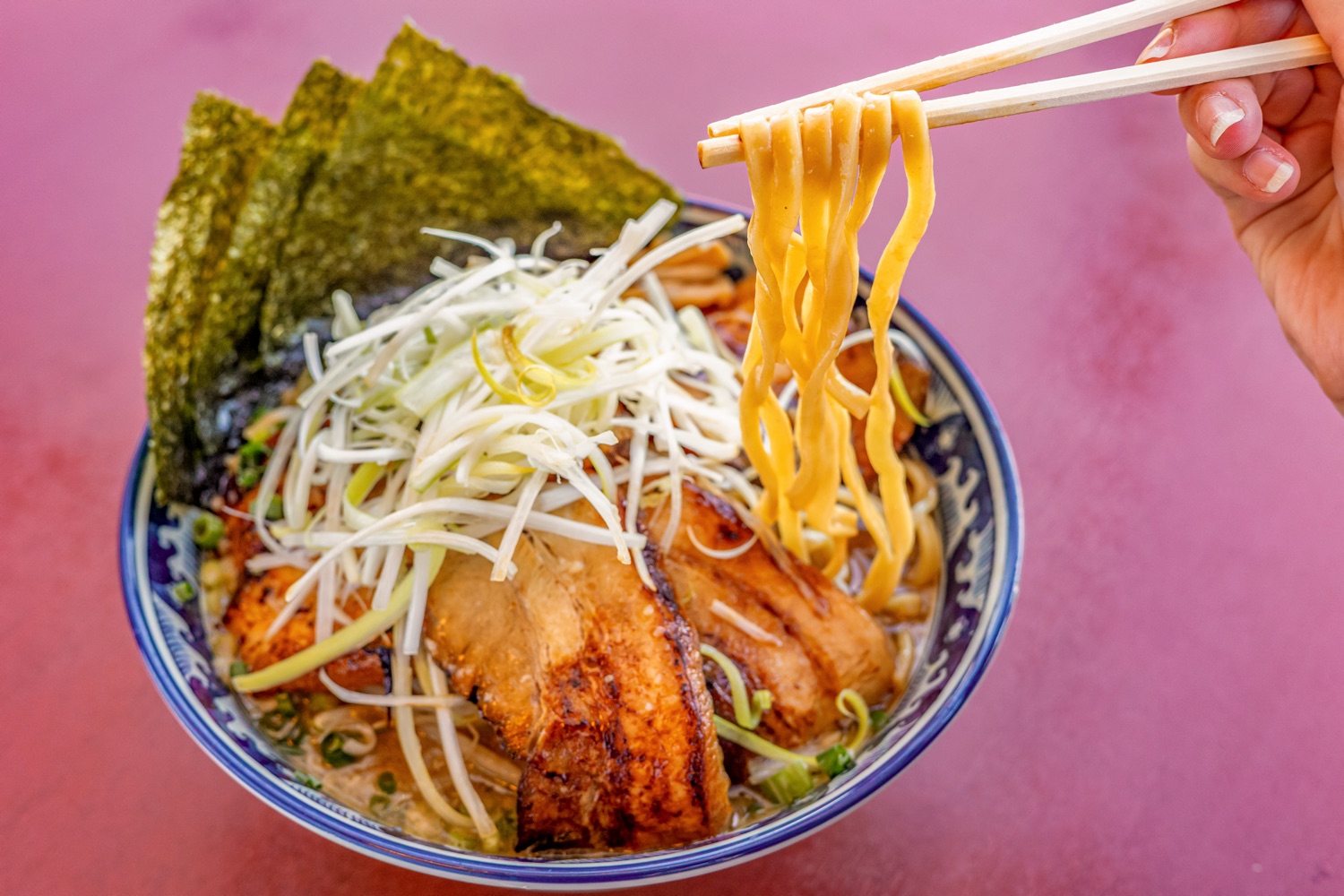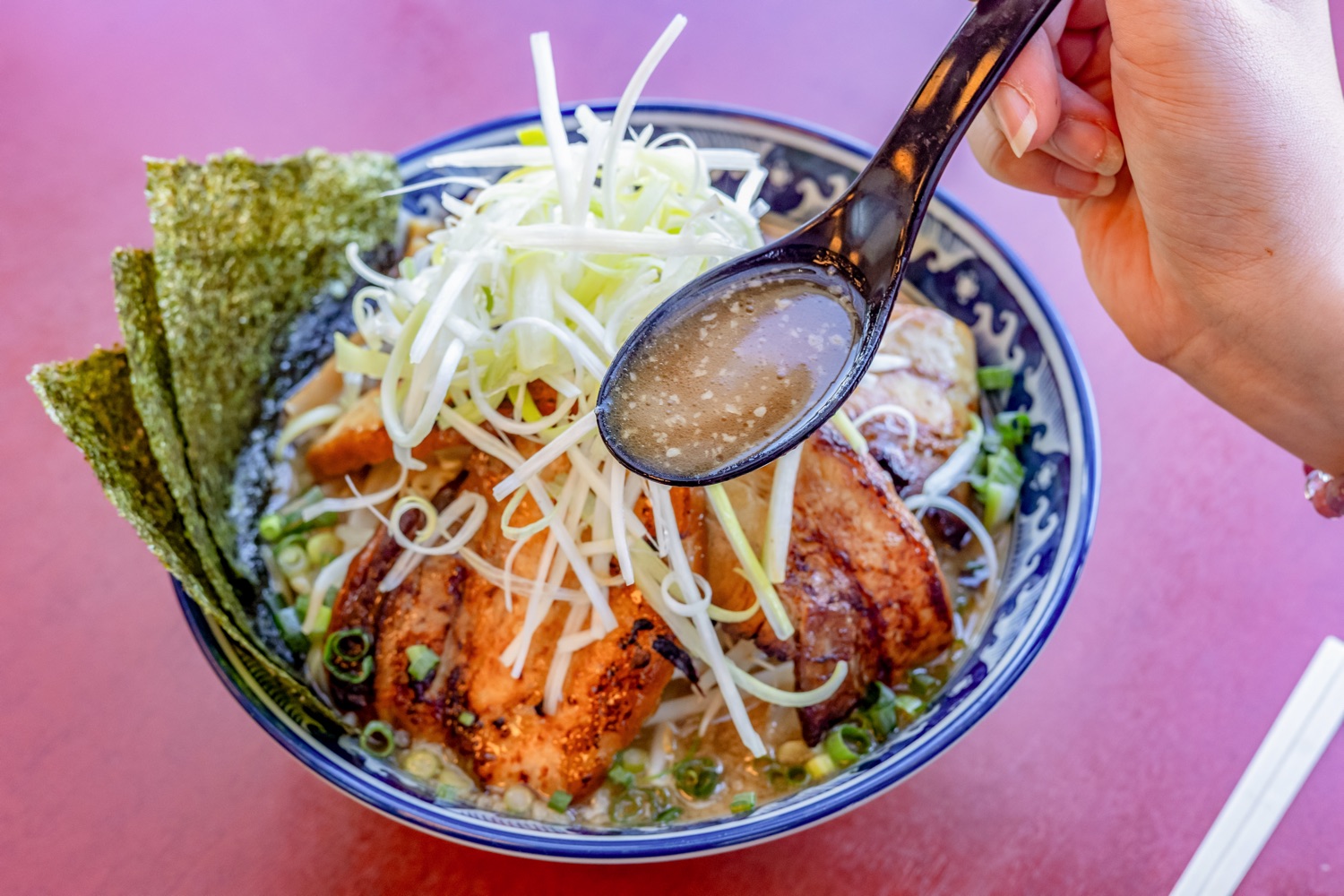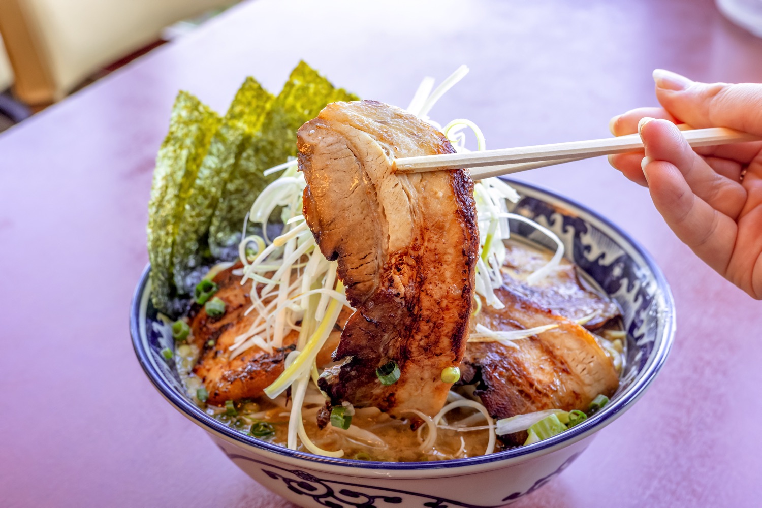 贅沢に5枚トッピングされ、こだわり抜いた柔らかくて香ばしい焼豚を存分に楽しめる。