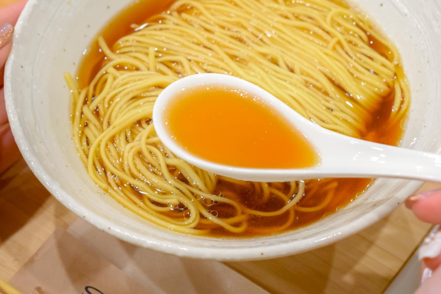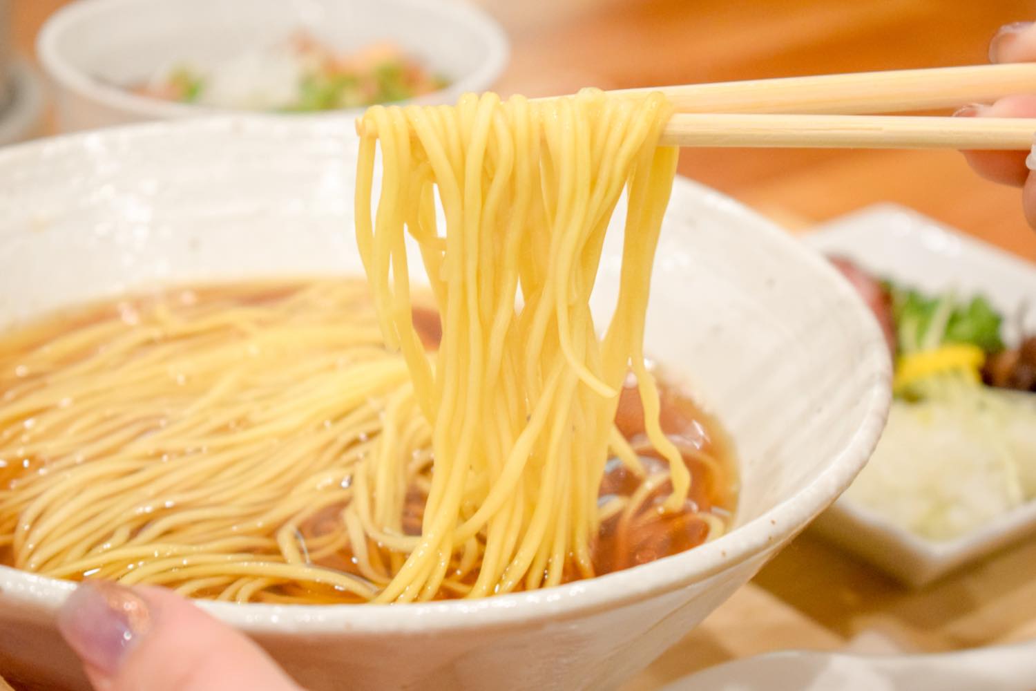 ガラと煮干しから旨味を抽出した出汁ベースの醤油淡麗スープは、醤油のコクを感じながらも後味すっきり!