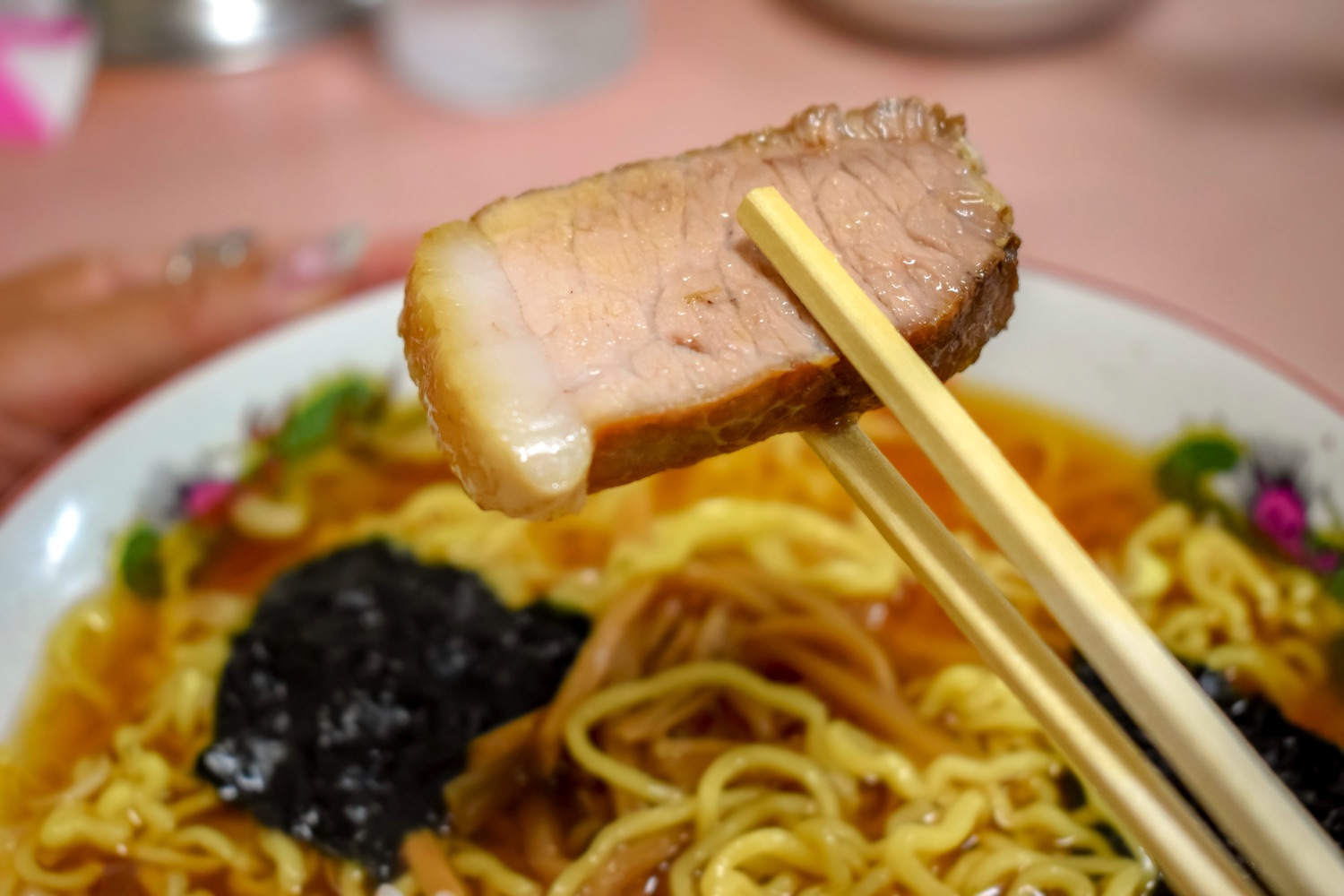 最近流行のしっとりやわらか系チャーシューとは一線を画す、やや小ぶりな豚もものチャーシューは、分厚く肉々しい歯ごたえを堪能すべし。