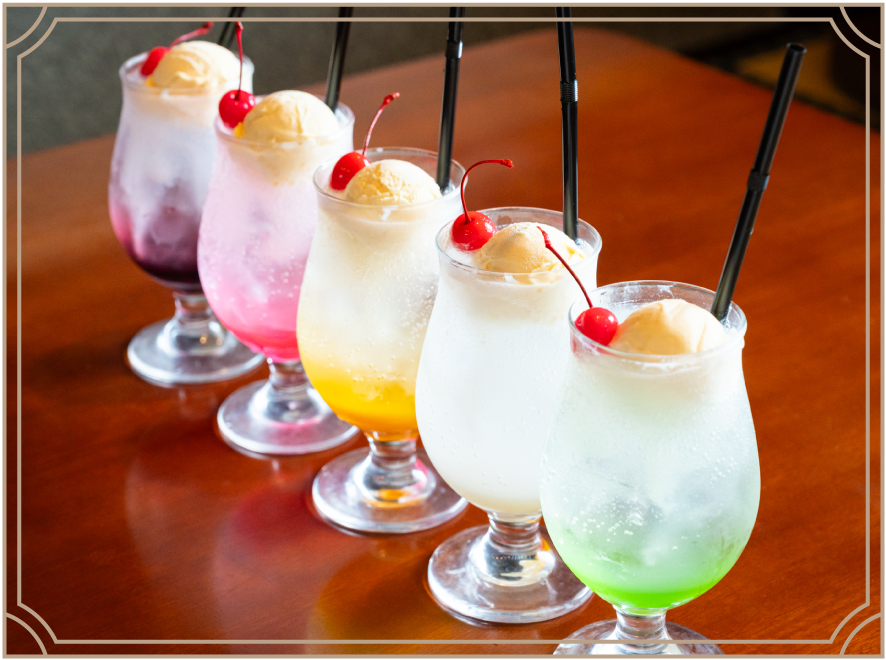 クリームソーダのラインナップはなんと、10種類!コーラや巨峰、パインなどカクテルなどにも使われる「captain」のシロップを使用。豊富なバリエーションとクオリティの高いこちらのシロップは色彩がはっきりと出て、ソーダとのグラデーションが美しい。10種類ある中でも、トロピカルピーチ味は見た目の可愛さだけでも十分癒されるが、アイスの濃厚な甘さとしゅわしゅわな炭酸の味わいにもまた、大満足でき、幸せな気持ちに。