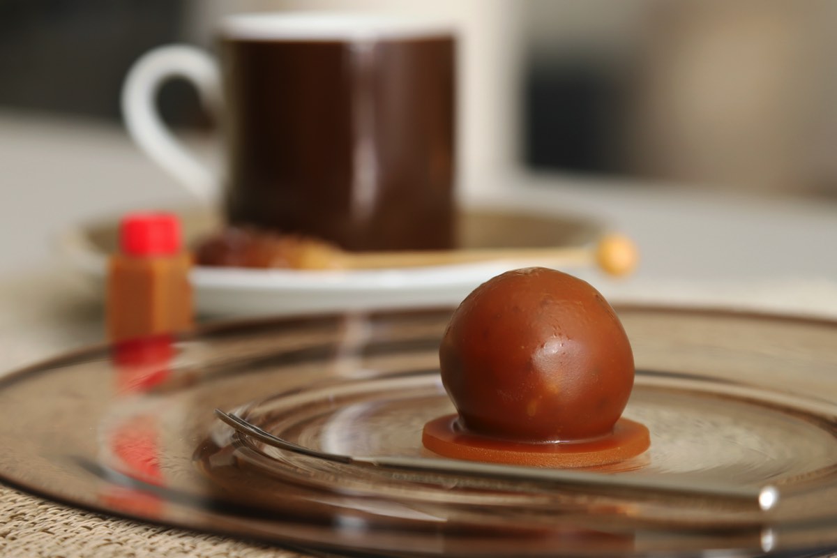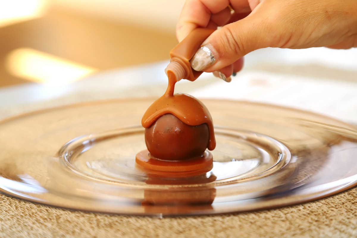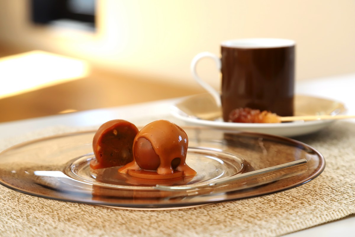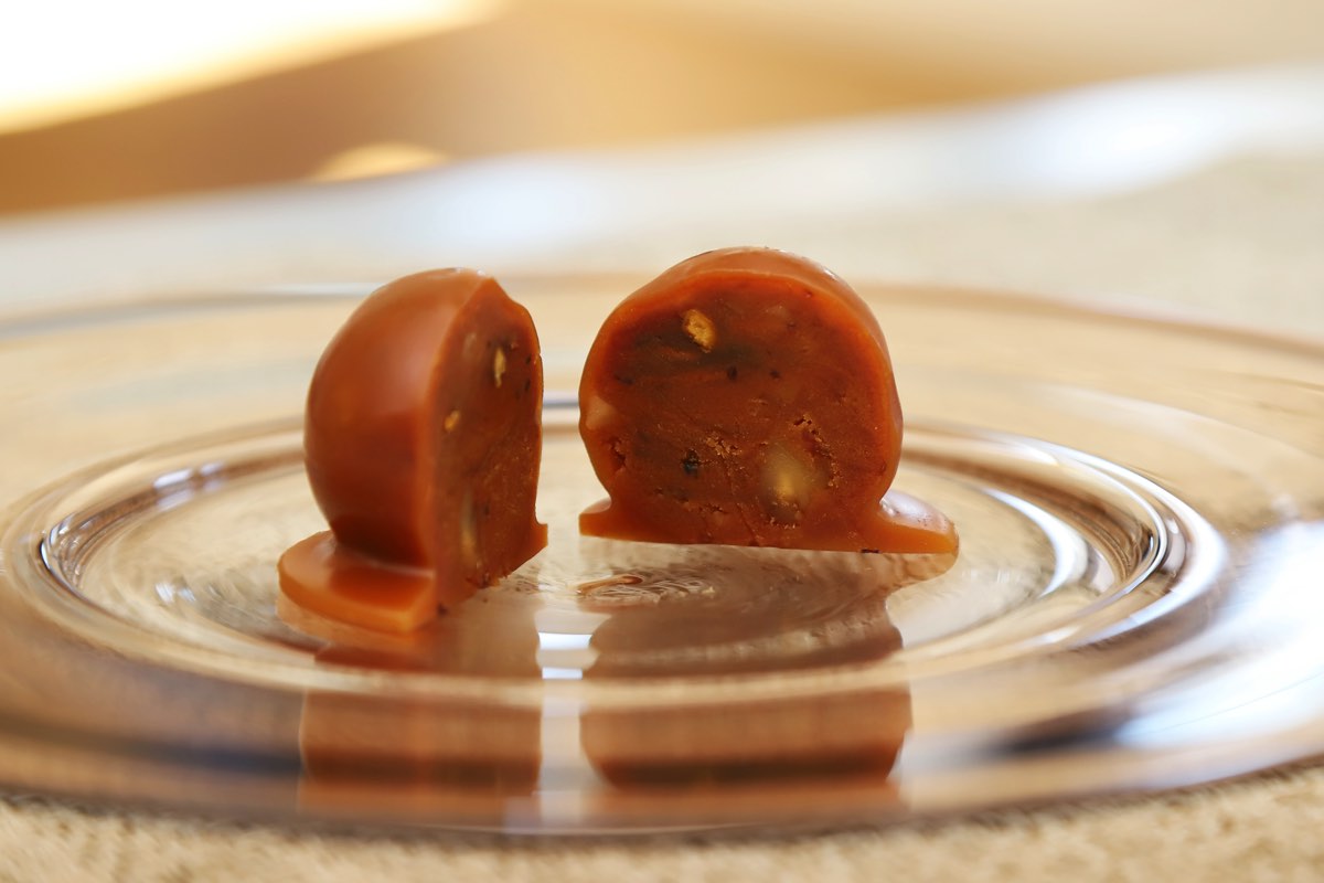 さらに、キャラメル餡にはシチリア産ヘーゼルナッツ、スペイン産アーモンド、長野産和ぐるみを香ばしく煎って刻み、あえて歪な味わいで食感と香ばしさの調和を楽しんで。