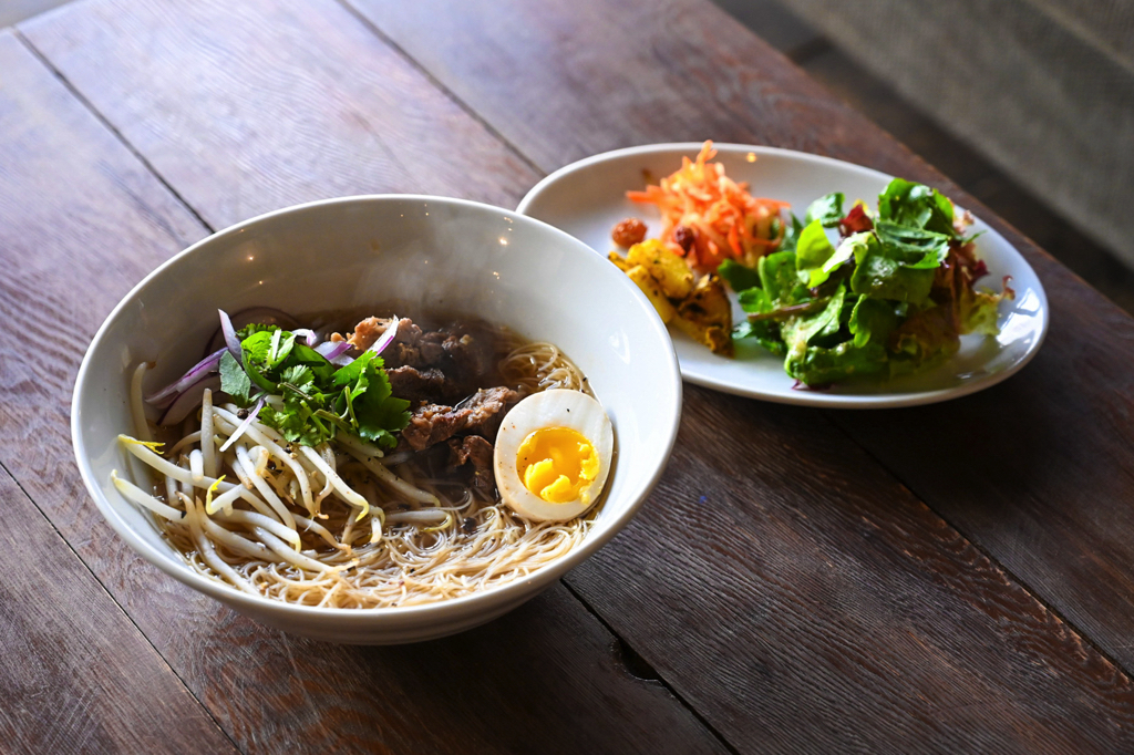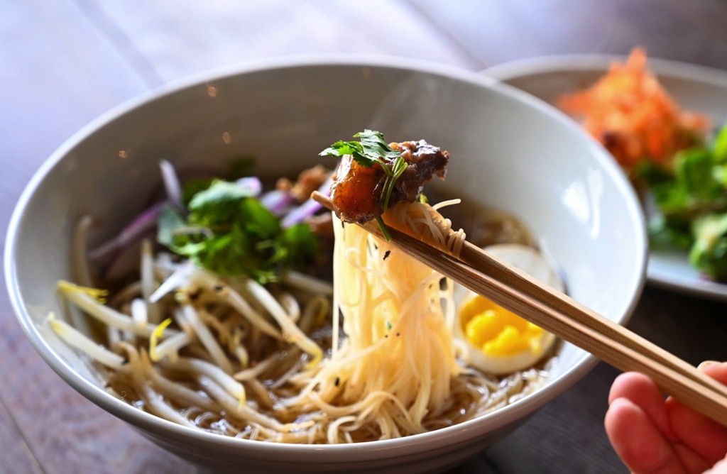 細麺のビーフンと、アジアンな香りが食欲をそそるコク深いスープ、トロトロになるまで煮込んだ牛スジを盛り込んだ、滋味あふれるひと品。副菜にはインド版お漬物の『大根のアチャール』と、レーズンとリンゴのやさしい甘みが広がる『にんじんとリンゴのソムタム』、オリジナルドレッシングが爽やかな『グリーンサラダ』が添えられ、目も舌も飽きさせない。どれも本場のテイストながら日本人にも馴染みやすいバランスに整えられていて、何度でも食べたくなる美味しさだ。