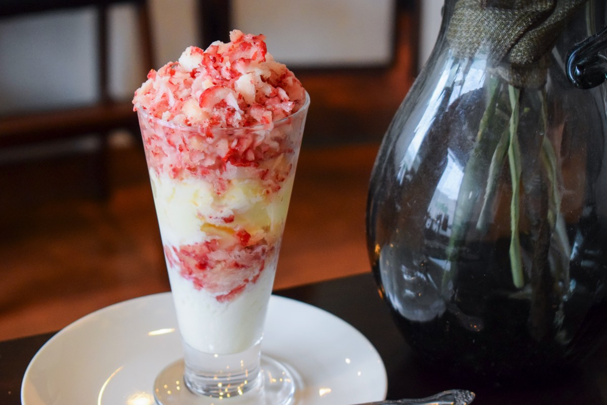 昭和町県産いちごのミルク氷を削ったふわふわ氷の、口に含んだとたんとろけるような食感に魅了される。エスプーマのホイップクリームをたっぷりのせ