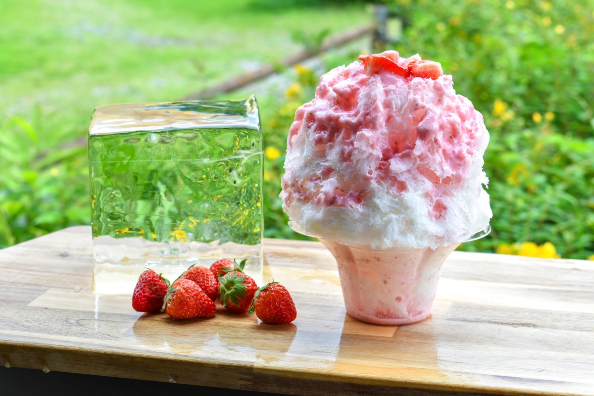 南アルプス 蔵元八義の天然氷を使った赤い屋根自慢のかき氷。天然氷を極限まで薄く削り、食感を損なわないように仕上げたふわっふわな氷はもちろん、注目すべきポイントは、そこに合わせるオリジナルシロップ!山梨県産桃を丸ごと1個使用し、作り置きせず毎朝手作りしているから、桃そのものの旨味がたっぷりと堪能できちゃう♪この時期ならではの旬のフレッシュな味わいが、口いっぱいに広がる魅惑のひと品を楽しもう。