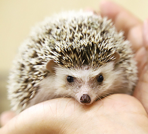 ハリネズミといえばトゲトゲの針。もちろんこの針は痛いけど、それは威嚇して立てている時だけ。リラックスしているときは針を寝かせているので、生えている方向に沿ってなでればまったく問題なし。ちなみに、この針は毛が硬化したものなんだとか。