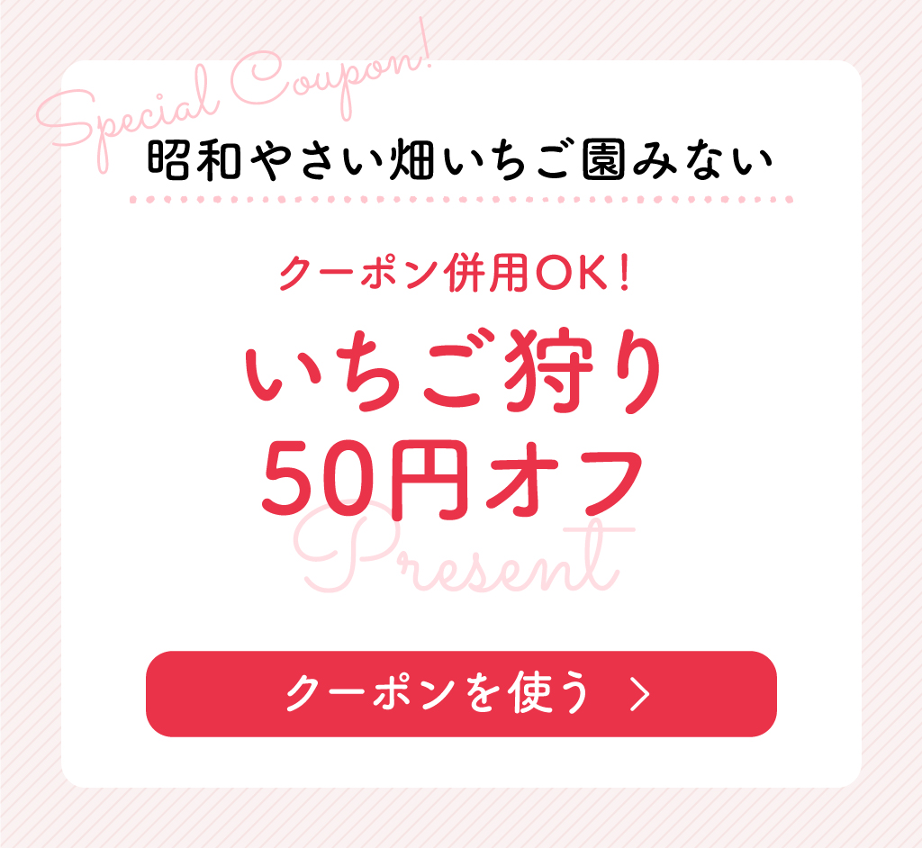 イオンモール甲府昭和のすぐ横の好立地に位置するいちご園みない。これから旬を迎える美味しいイチゴがたくさんご!基本コースは、香り豊かな「章姫(あきひめ)」を思う存分食べ放題で楽しめる。来訪者ごとに区切ったプライベートエリア制で、車椅子の方や小さな子ども連れのファミリーもゆっくりと1日を過ごせるのもいい。基本コースのいちご狩りは1,100円~